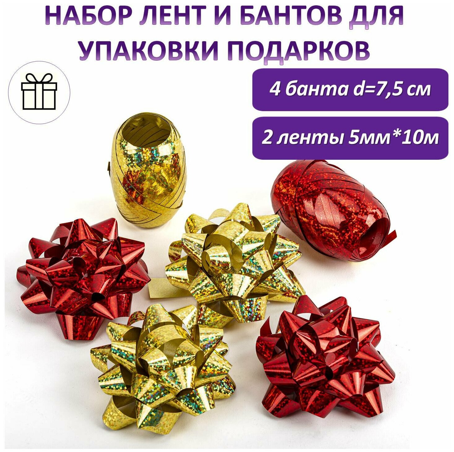 Набор для декора и подарков 4 банта, 2 ленты, голография, цвета красный, золото, золотая сказка, 591849 информация: