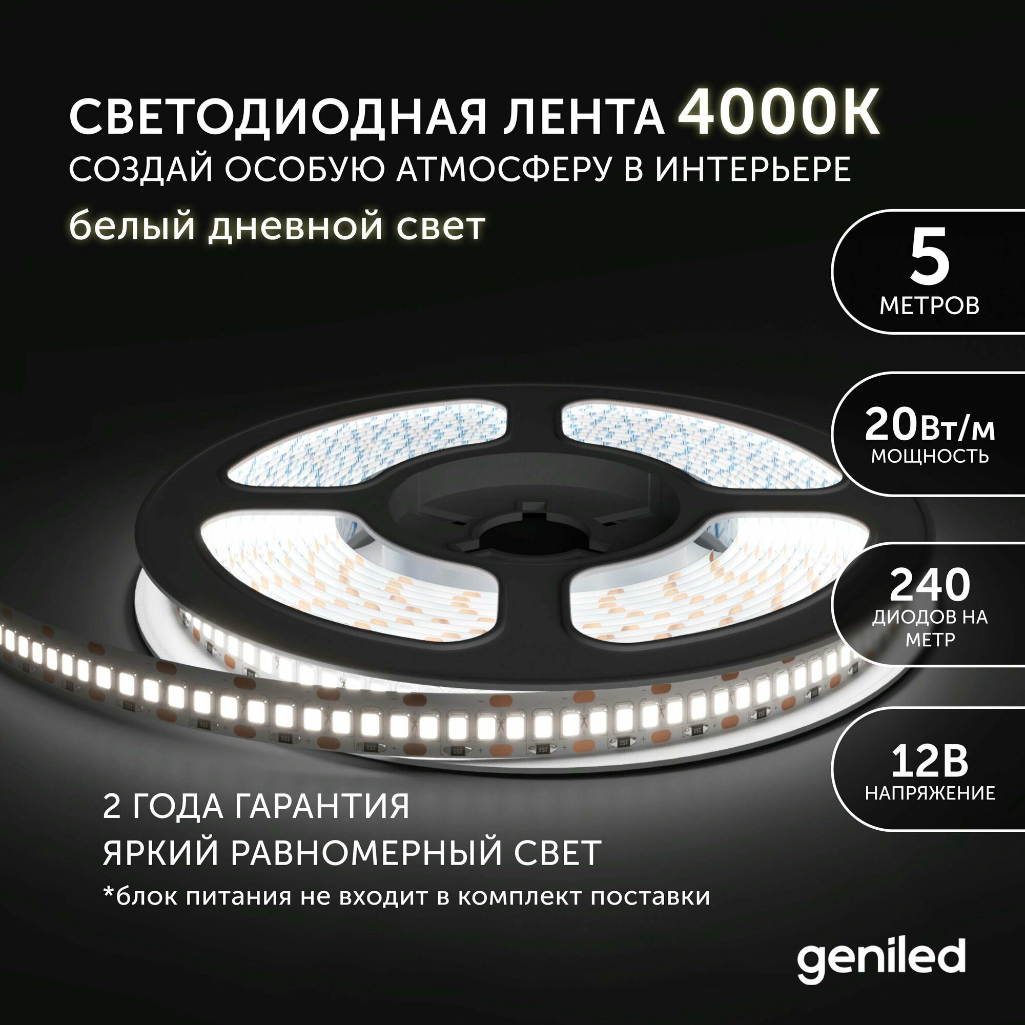 Geniled Светодиодная лента с дневным белым светом GL- 240SMD2835 12В 2040Лм/м 20Вт/м 10х5000мм 3800-4200К IP33 информация: