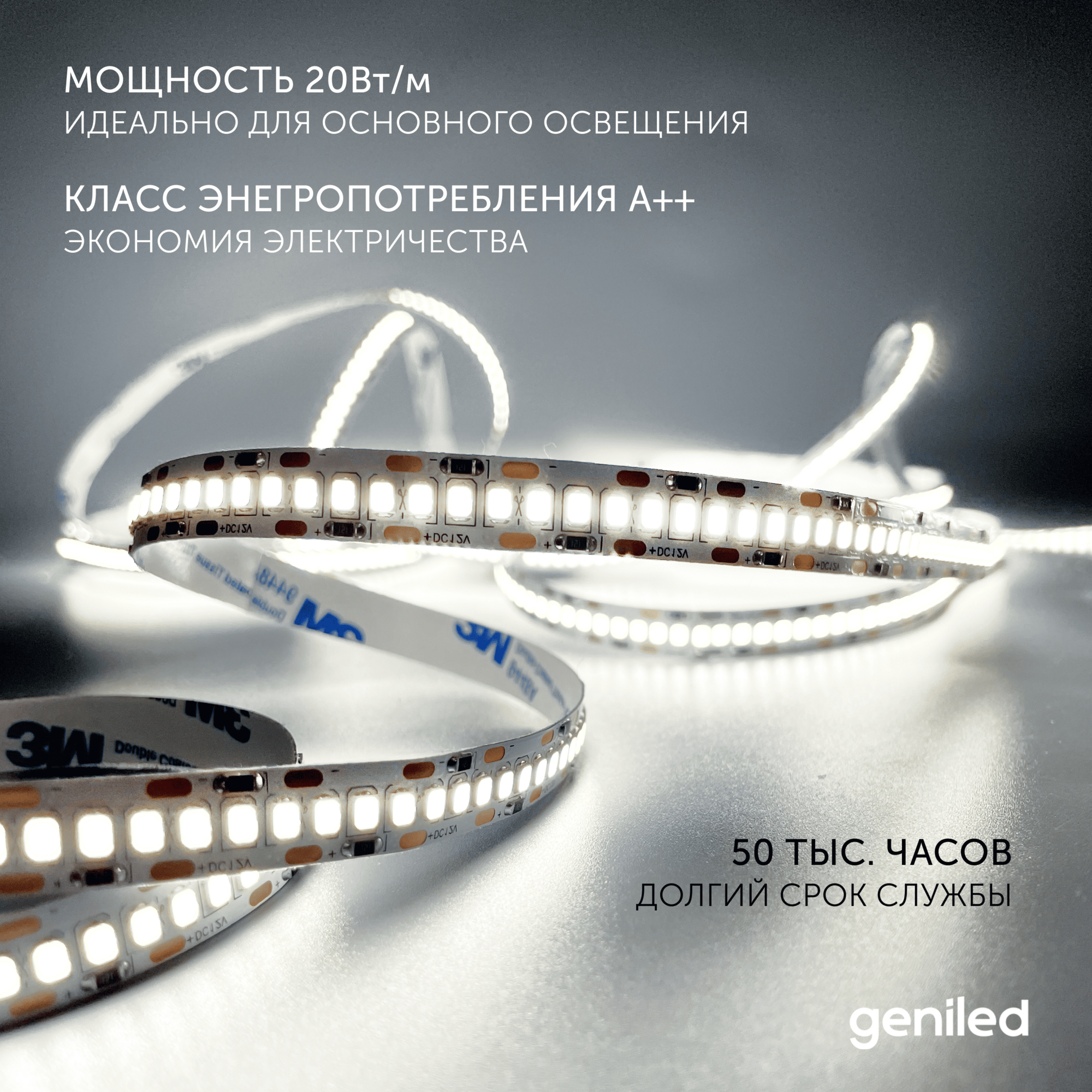 Светодиодная лента, подсветка Geniled - для комнаты, в гардероб, на кухню - Белый Нейтральный свет / GL-240SMD2835 / 2040 Лм/м / 12В / длина - 5м / B - 10 мм / W - 20 вт / 4200 К / IP33 3 513 ₽