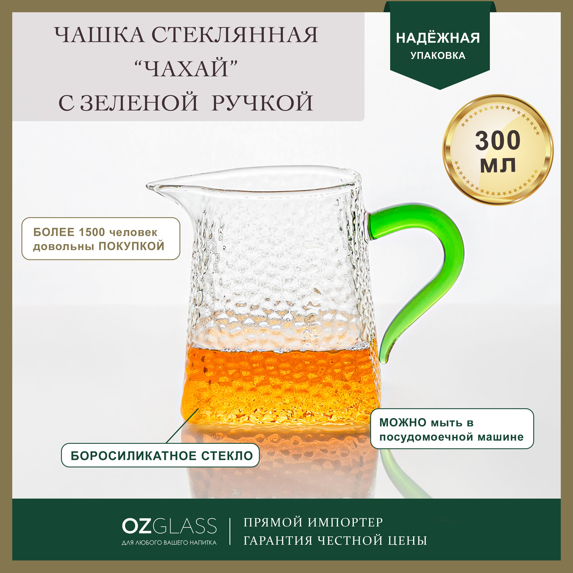 Отзывы на Чашка OZGLASS Чахай, стекло, 300мл, прозрачная, с зелёной ручкой