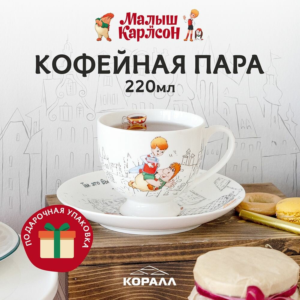 10 цен на Чайная кофейная пара фарфор 220 мл. в подарочной упаковке "Малыш и Карлсон" круглая чашка с блюдцем