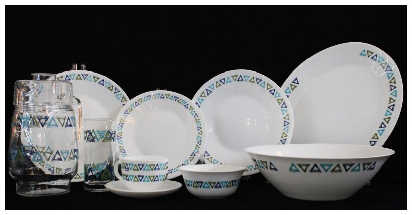 | Состав набора | блюдо, блюдце, кружка, крышка, кувшин, пиала, салатник, стакан, тарелка десертная, тарелка обеденная, тарелка суповая, чашка |