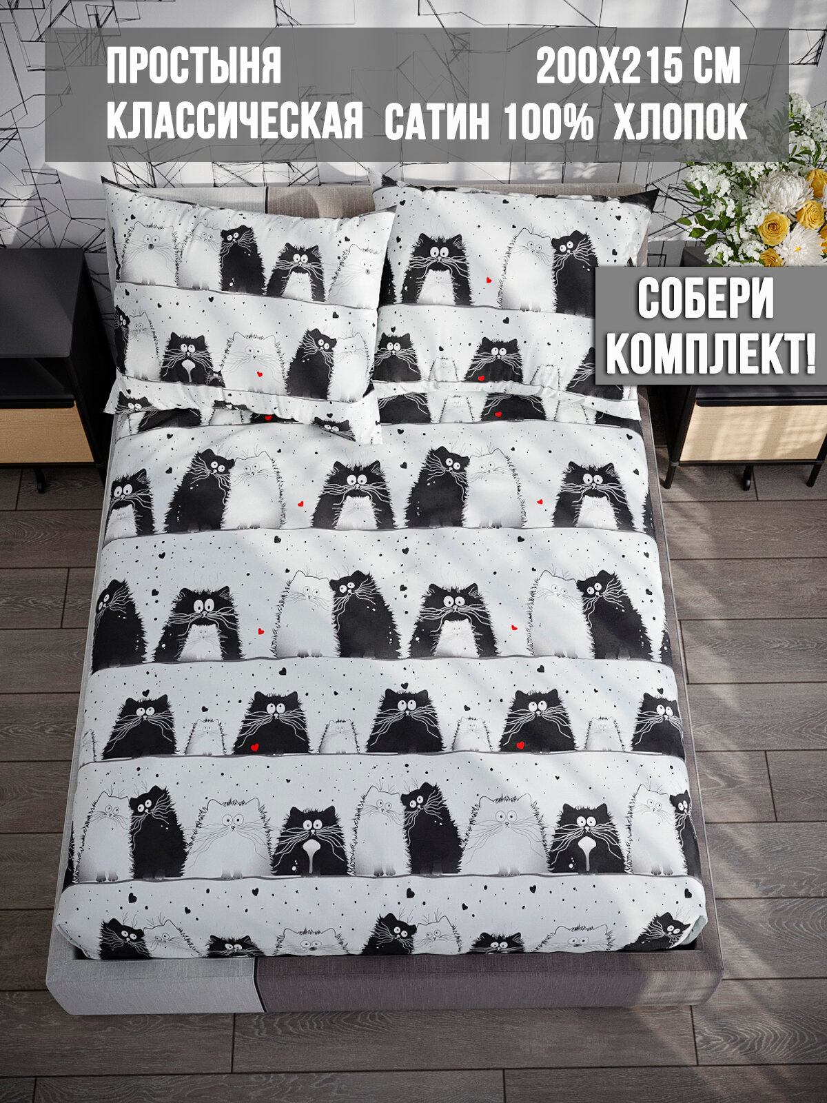Простынь сатин Milky Garden "котики (компаньон)" 200х215 см, 2-спальная, классическая, сатин, хлопок 100% 1 090 ₽