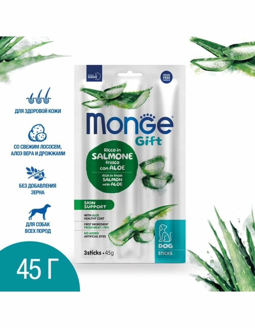 Лакомство Monge Gift Skin support для собак всех пород "Мягкие палочки" со свежим лососем, алоэ вера и дрожжами для здоровой кожи 45 г информация:
