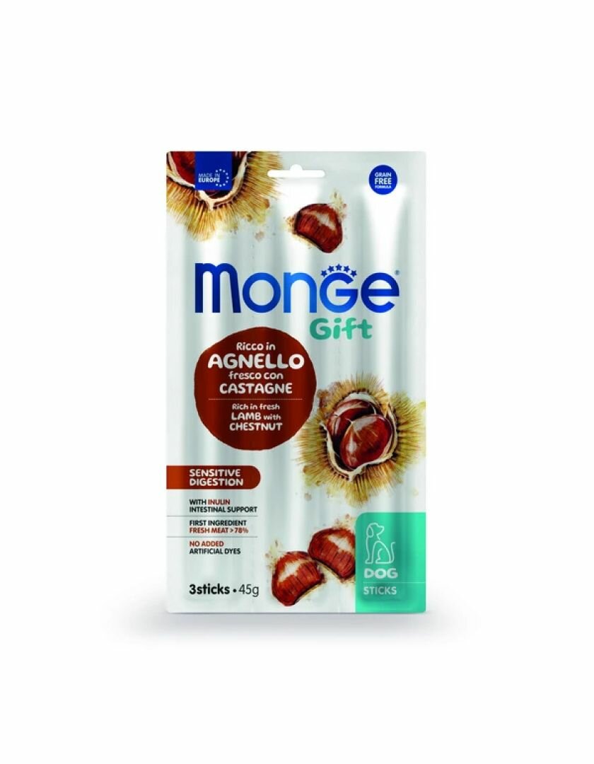 Лакомство Monge Gift Sensitive digestion для собак всех пород "Мягкие палочки" со свежим ягненком и каштаном для чувствительного пищеварения 45 г 564 ₽