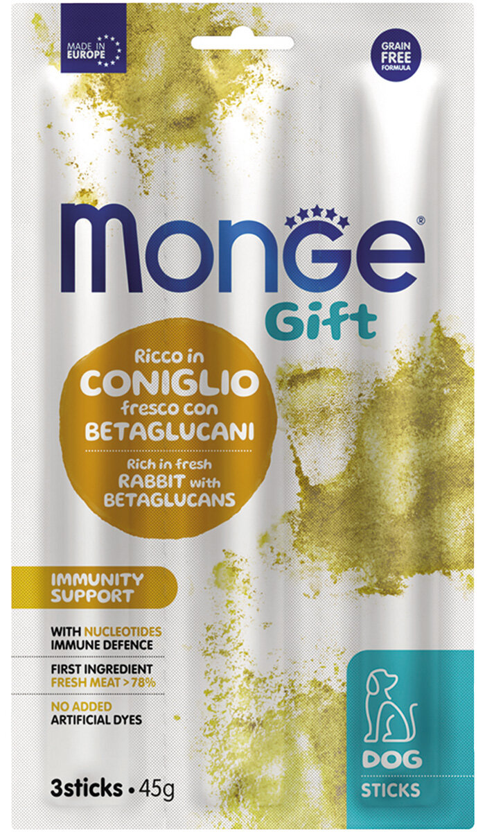 Лакомство Monge Gift Immunity support для собак всех пород "Мягкие палочки" со свежим кроликом 45гр . информация: