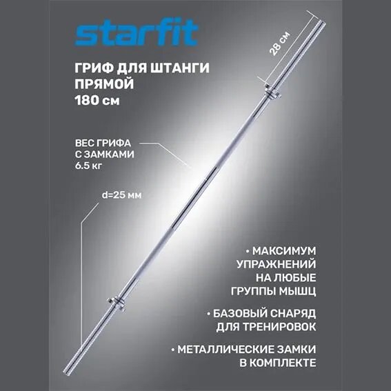 Гриф для штанги прямой Starfit BB-103 180 см, d=25 мм, металл, с замками, хром УТ-00019779 . информация:
