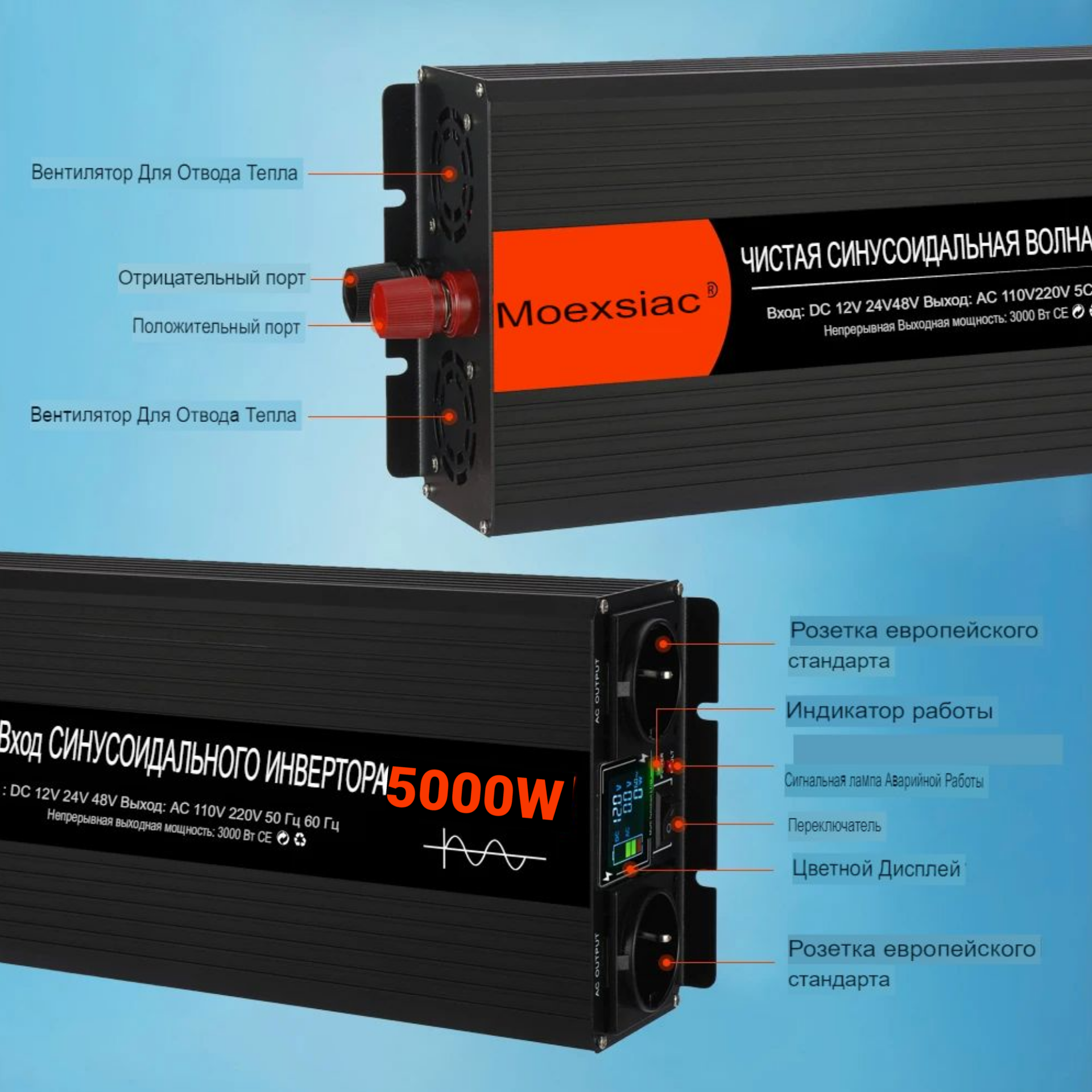 Автомобильный преобразователь напряжения инвертор MOEXSIAC 6000w 12v-220v Power inverter Чистый синус 17 580 ₽