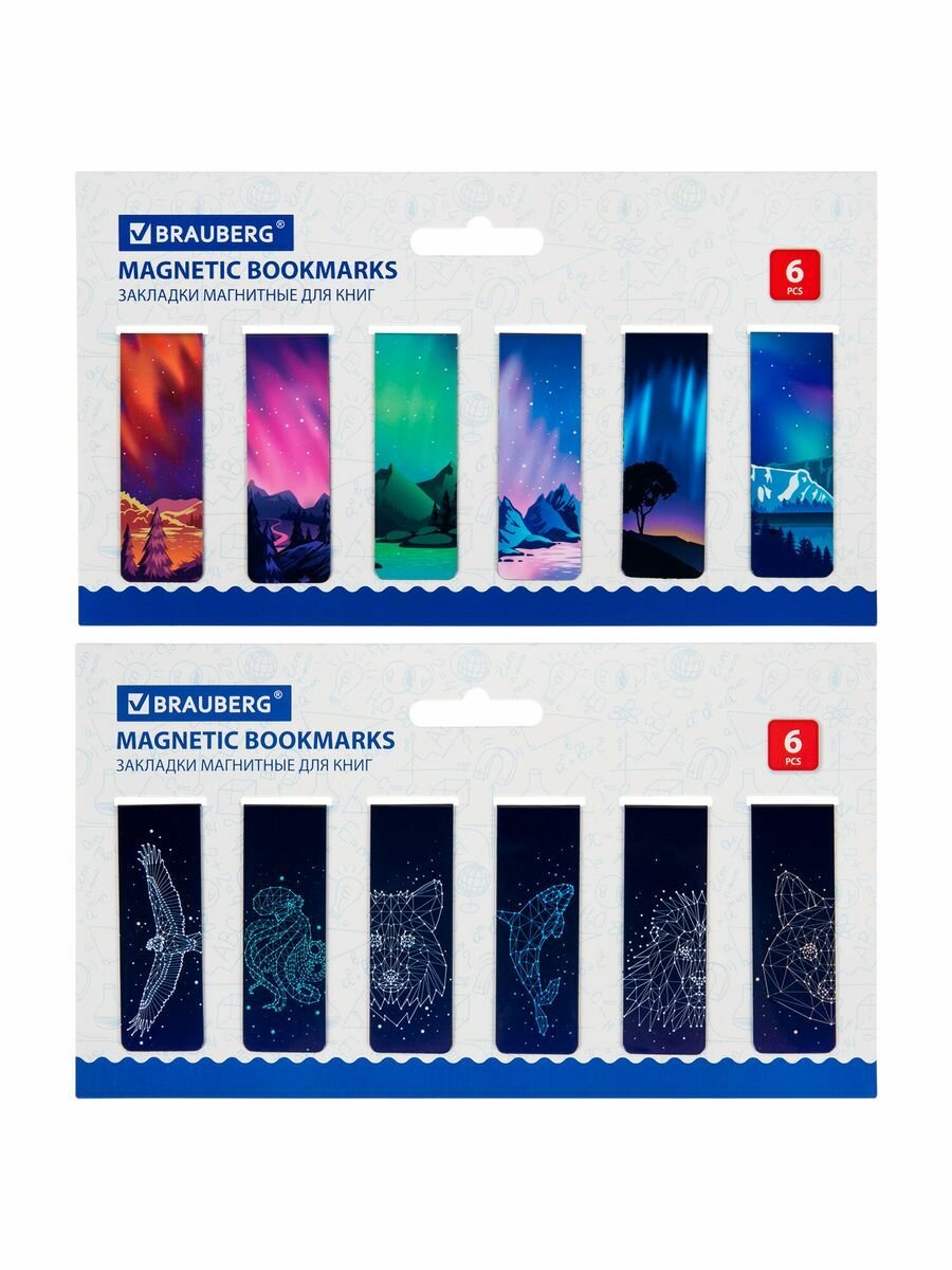 Закладки канцелярские магнитные для книг книжные в школу, для учебников, тетрадей, для ежедневника, Sunset, набор 6 штук, 30х25 мм, Brauberg, 113169