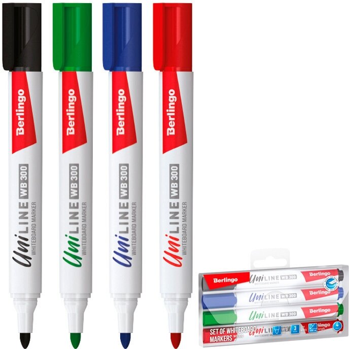 Набор 4 шт. - Маркеры для белых досок Berlingo "Uniline WB300", цветные, пулевидный наконечник, 3 мм BMc_30509 информация:
