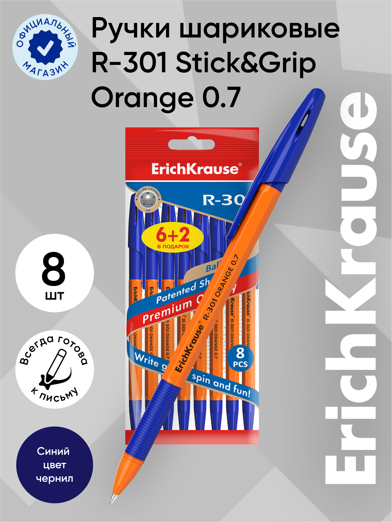 10 цен на Набор из 8 ручек шариковых ErichKrause R-301 Stick&Grip Orange 0.7, цвет чернил синий (в пакете)
