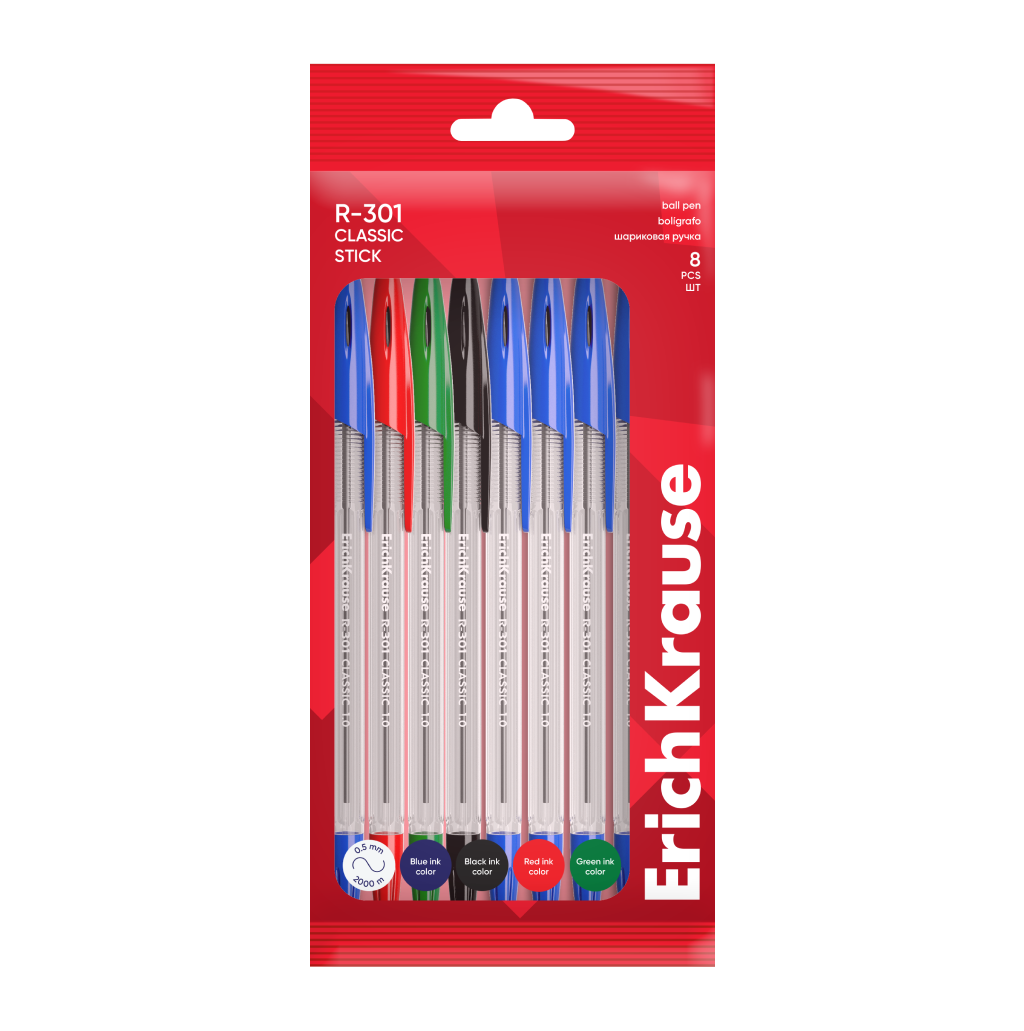 Набор из 8 ручек шариковых ErichKrause R-301 Stick Classic 1.0, цвет чернил: синий, черный, красный, зеленый информация: