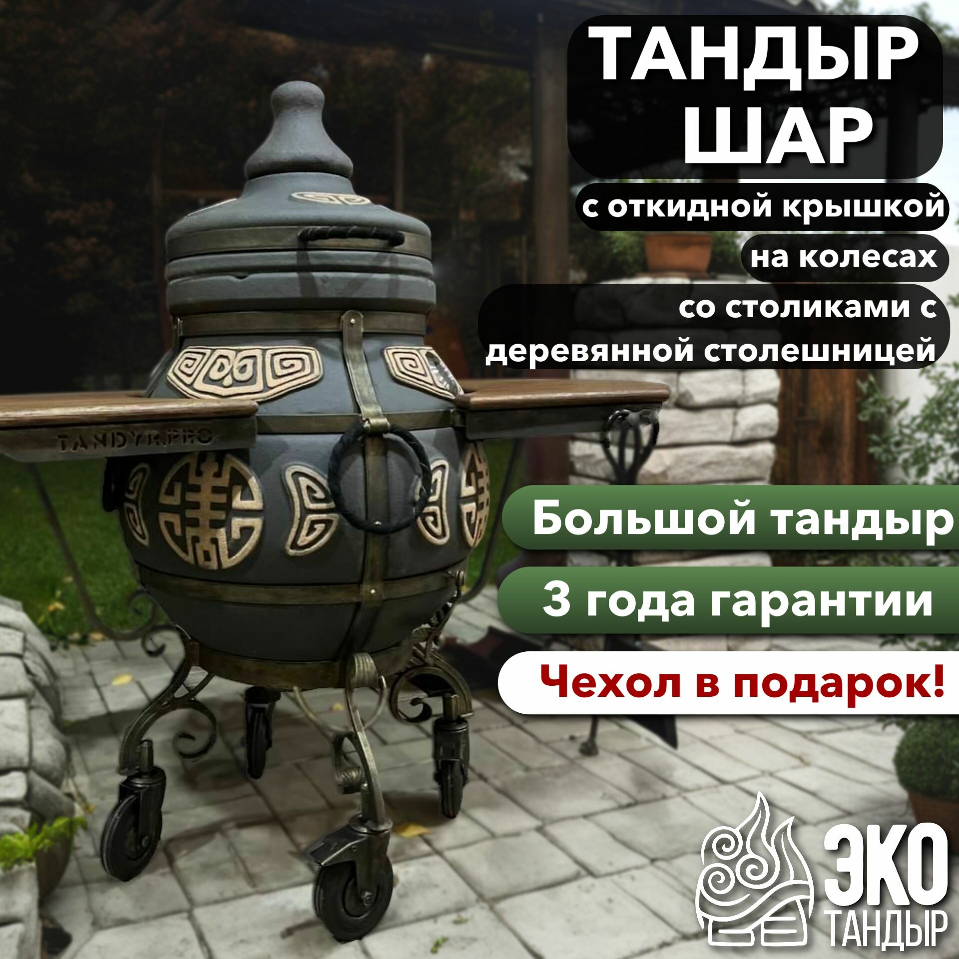 10 цен на Тандыр ЭкоТандыр Шар с откидной крышкой, с двумя столиками с деревянной столешницей и на колесах, цвет графит / большой тандыр для дачи