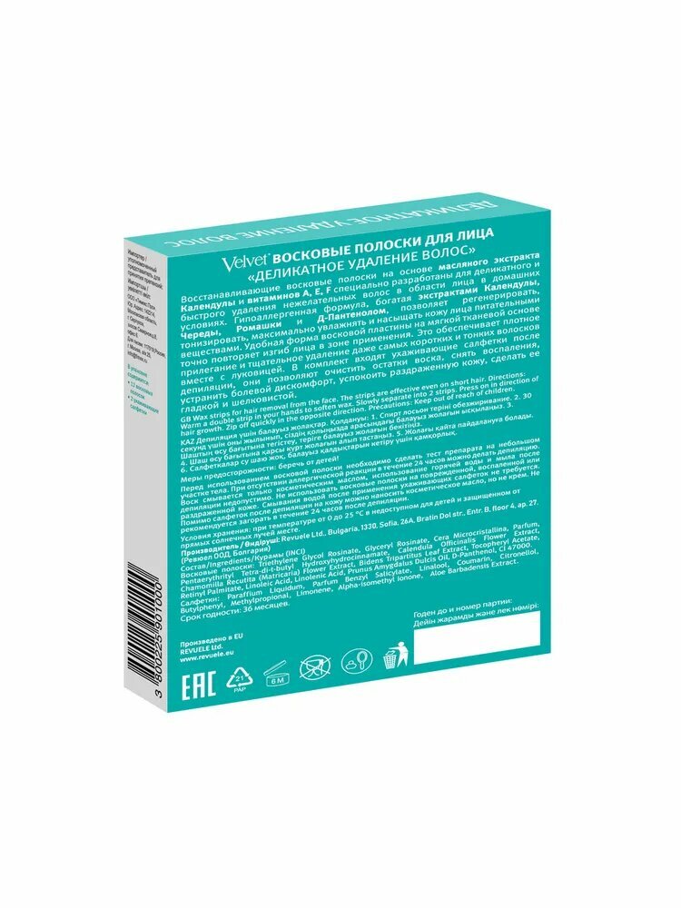 Восковые полоски Velvet CleanSkin, для лица, гипоаллергенные, 12 штук информация: