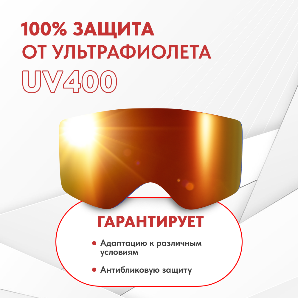 | Особенности | УФ-защита / быстрая смена линз / вентиляция / защита от запотевания / зеркальное покрытие / ношение поверх очков / поляризационный фильтр / съёмная линза |