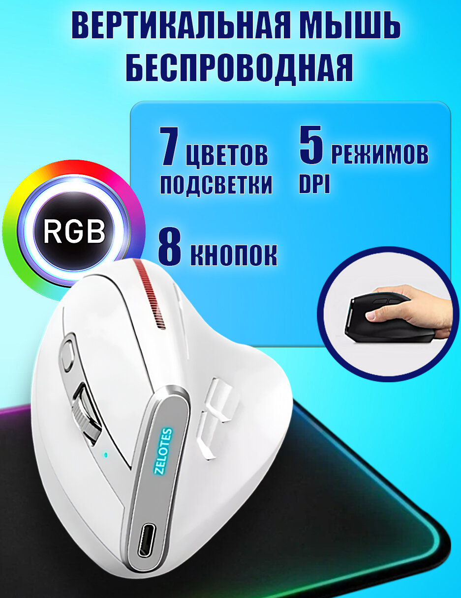 Отзывы на Вертикальная мышь беспроводная, ZELOTES F36, перезаряжаемая, с подсветкой RGB, для компьютера, белая