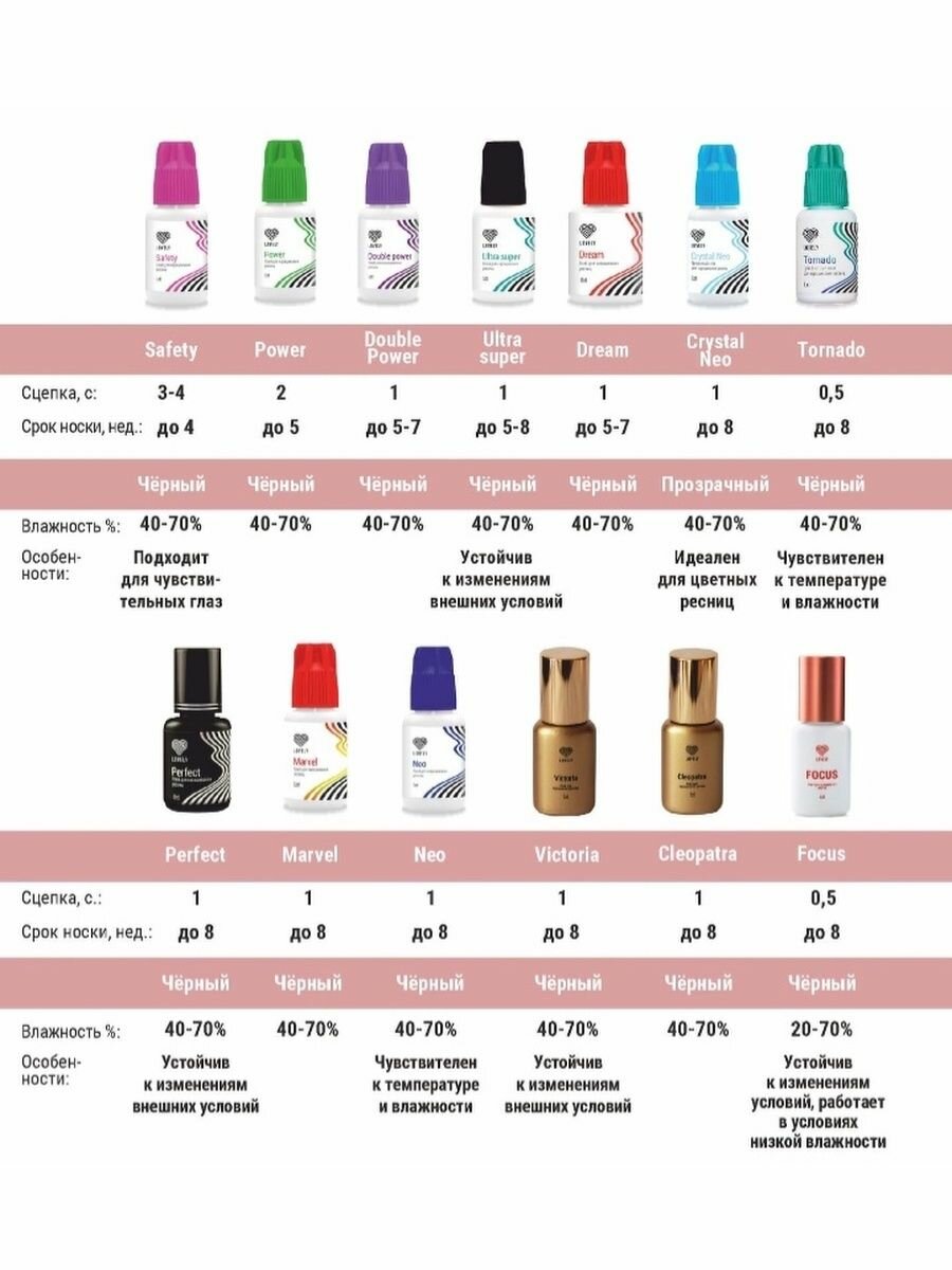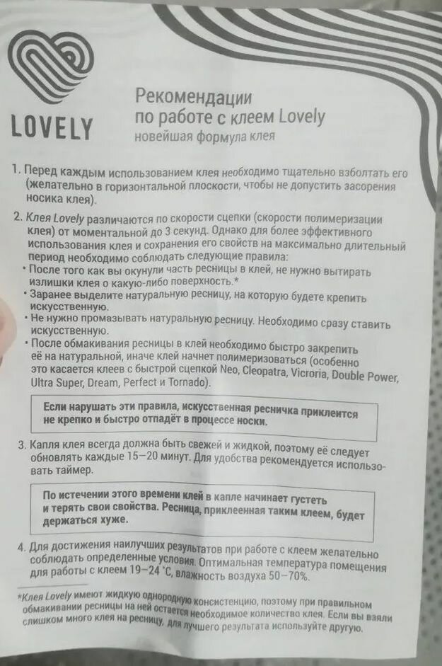 | Дополнительная информация | Способ применения: встряхнуть бутылочку с клеем несколько раз в горизонтальной плоскости и перед надавливанием на бутылочку перевернуть её носиком вниз, чтобы клей стёк к носику и не всасывался лишний воздух и влага. Налить каплю клея на специальную поверхность, быстро промокнить носик безворсовой салфеткой, чтобы избежать его засорения и закрыть крышечкой. Обмакнуть в выдавленной капле клея часть искусственной ресницы для последующего приклеивания к натуральной. |
