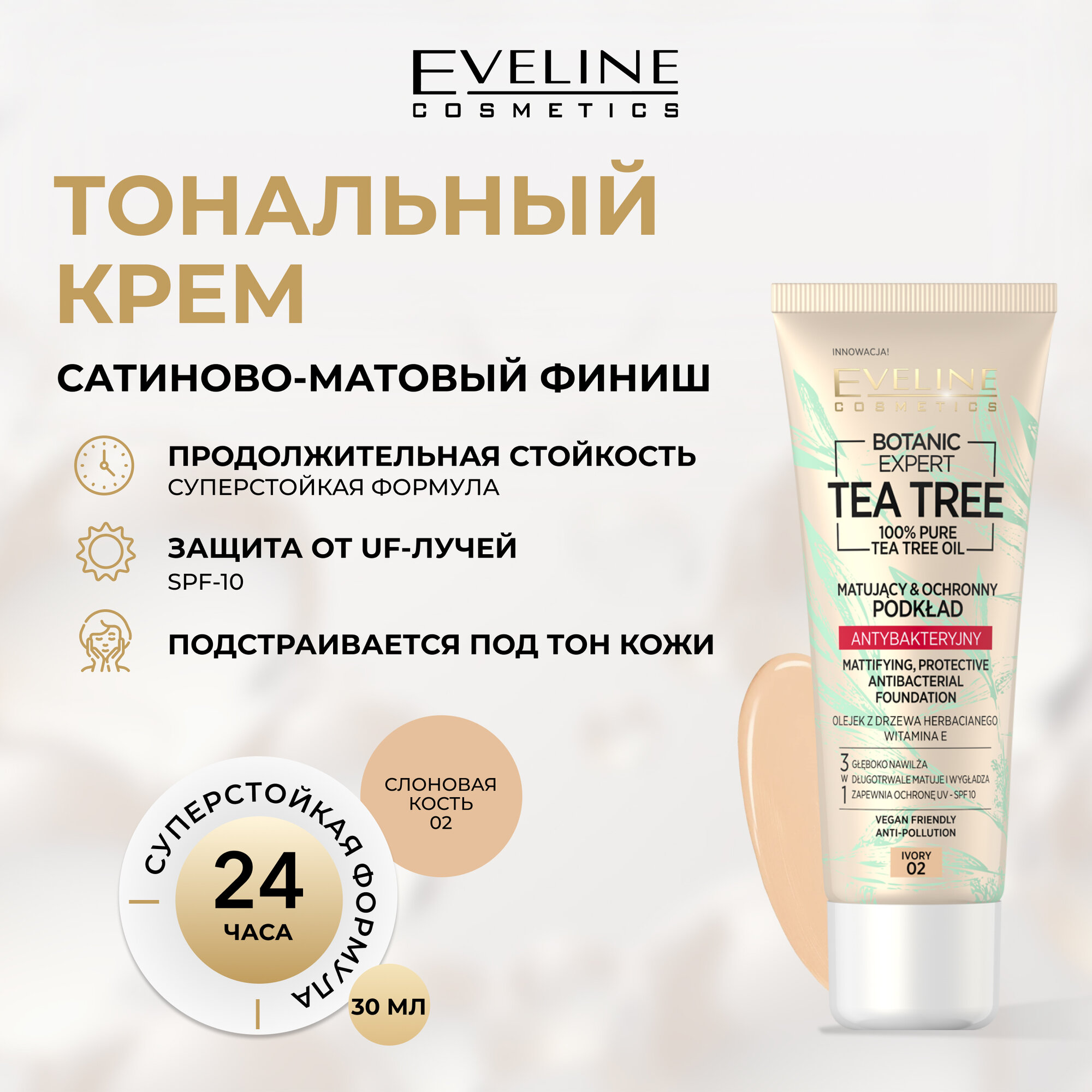 Тональный крем 3в1 EVELINE BOTANIC EXPERT матирующий антибактериальный №02 - IVORY, 30 мл информация: