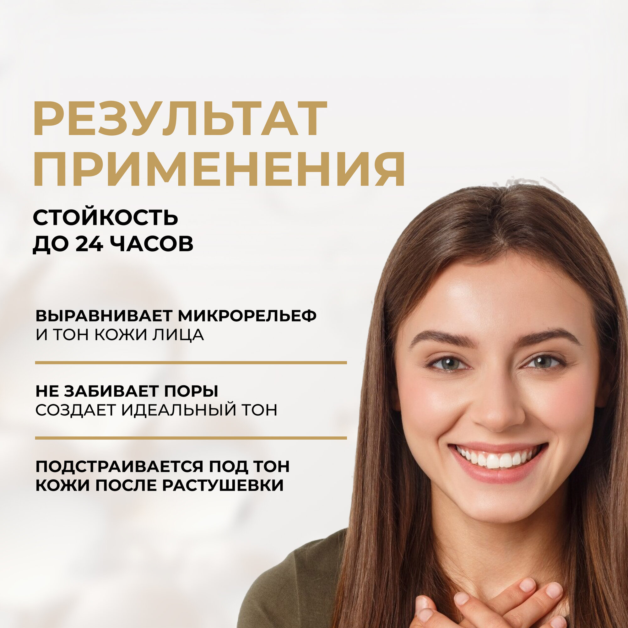 | Эффект | антибактериальный / выравнивание поверхности кожи / защита от солнца / маскировка несовершенств / матирование / омоложение / увлажнение / улучшение цвета |