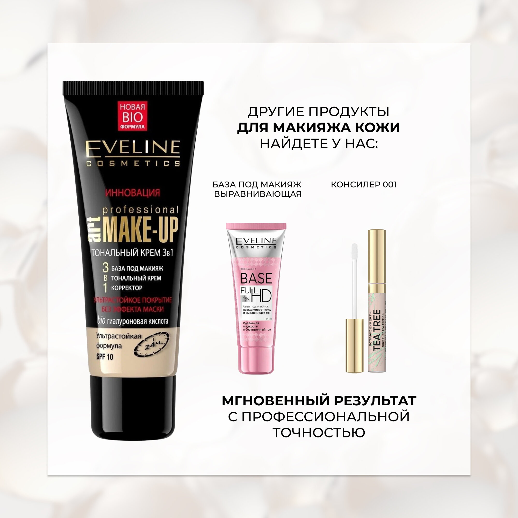 Тональный крем 3в1 EVELINE Art Professional Make Up 3в1, SPF 10 тон натуральный, 30 мл информация: