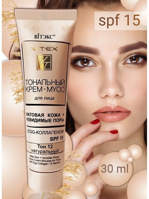 Витекс Vitex Тональный крем-мусс для лица. Матовая кожа+невидимые поры с EGG-коллагеном SPF15. 30мл, тон 12 информация: