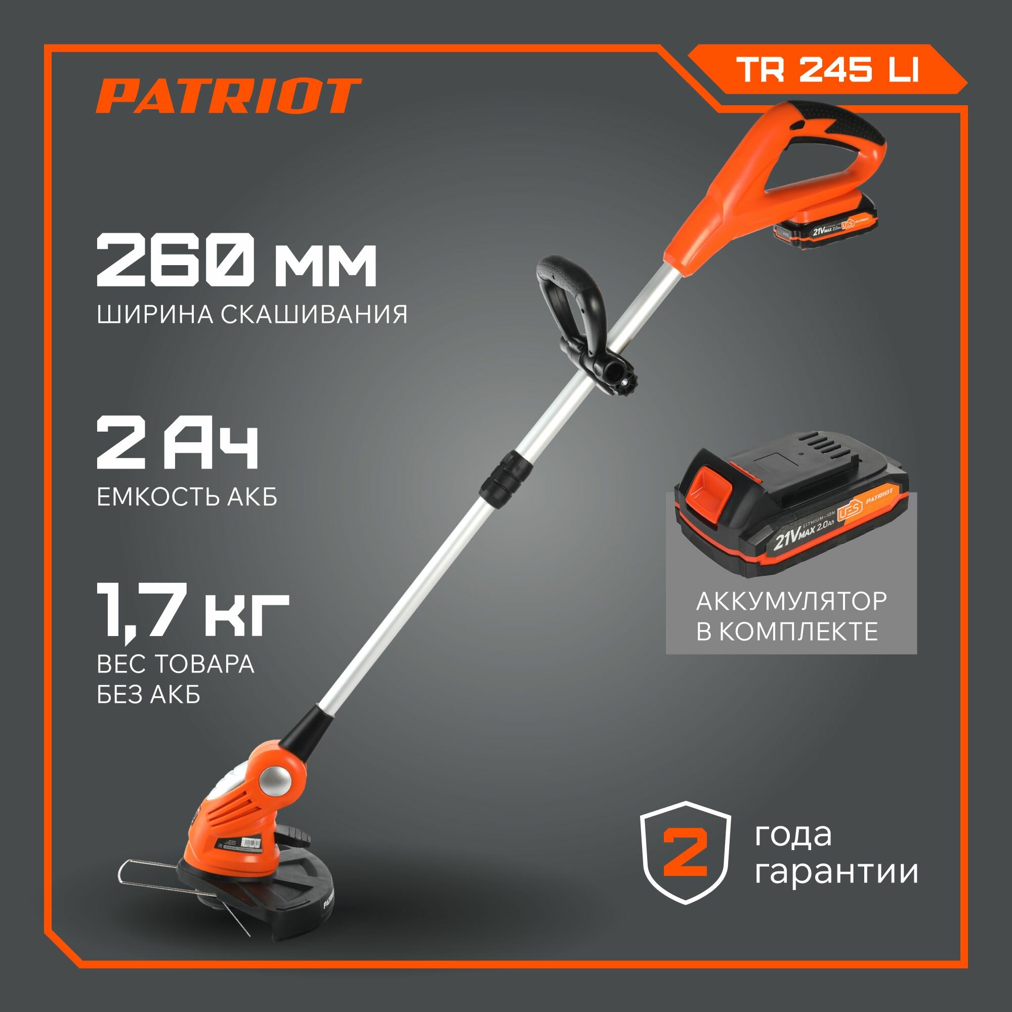 Триммер аккумуляторный PATRIOT TR 245Li, 2А·ч, 21 В, с АКБ, 26 см