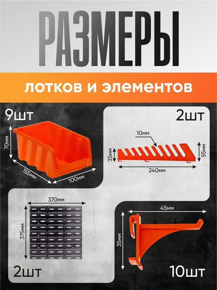 Отзывы на Органайзер для инструментов пластиковый, на стену, лотки 9 шт. 15,5х10х7 см оранжевый, черный, 37х2х37,5х2 см