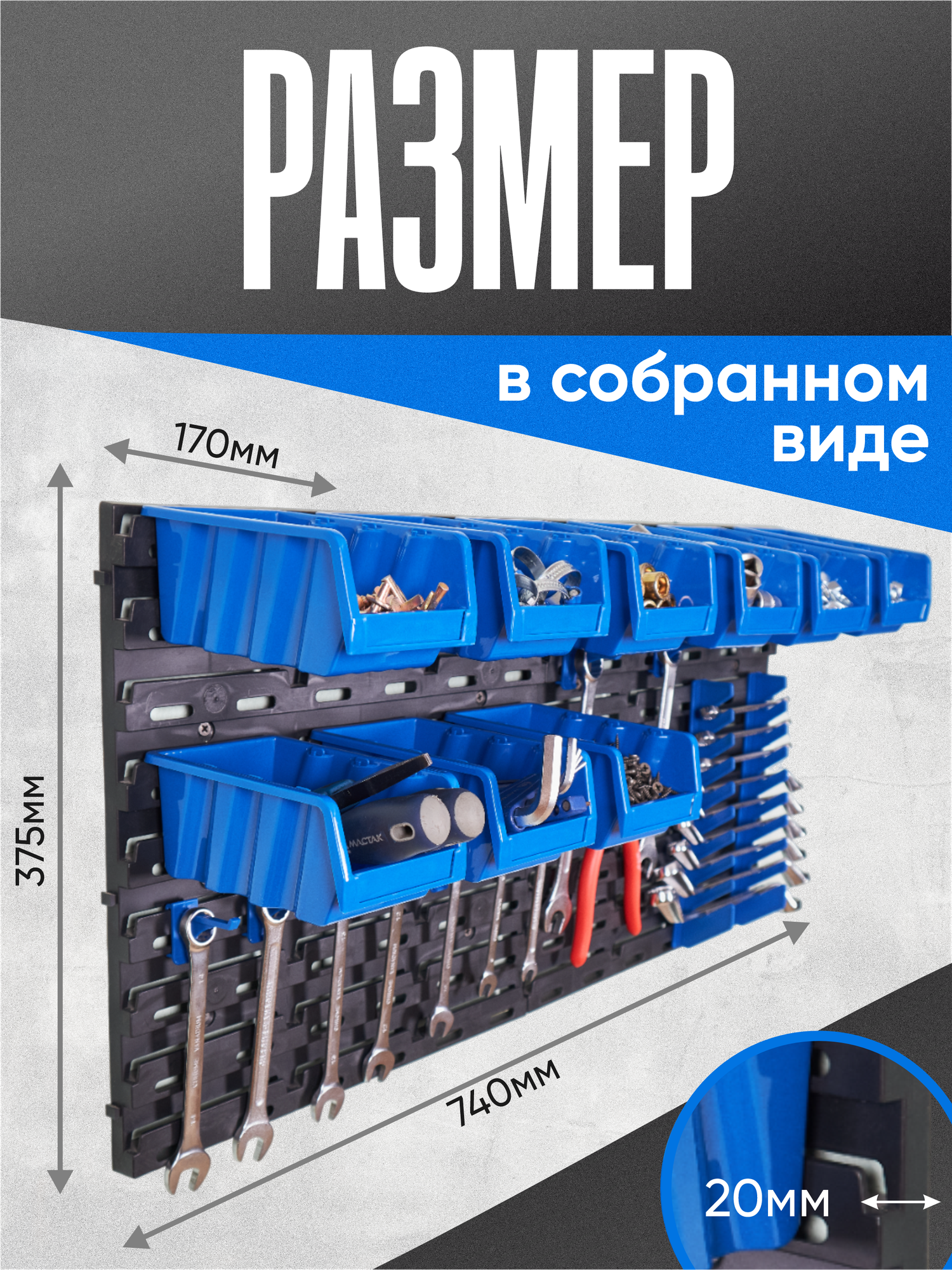 Органайзер на стену, пластиковый, лотки 9 шт. 15,5х10х7 см, для инструментов, синий, 37х2х37,5х2 см информация: