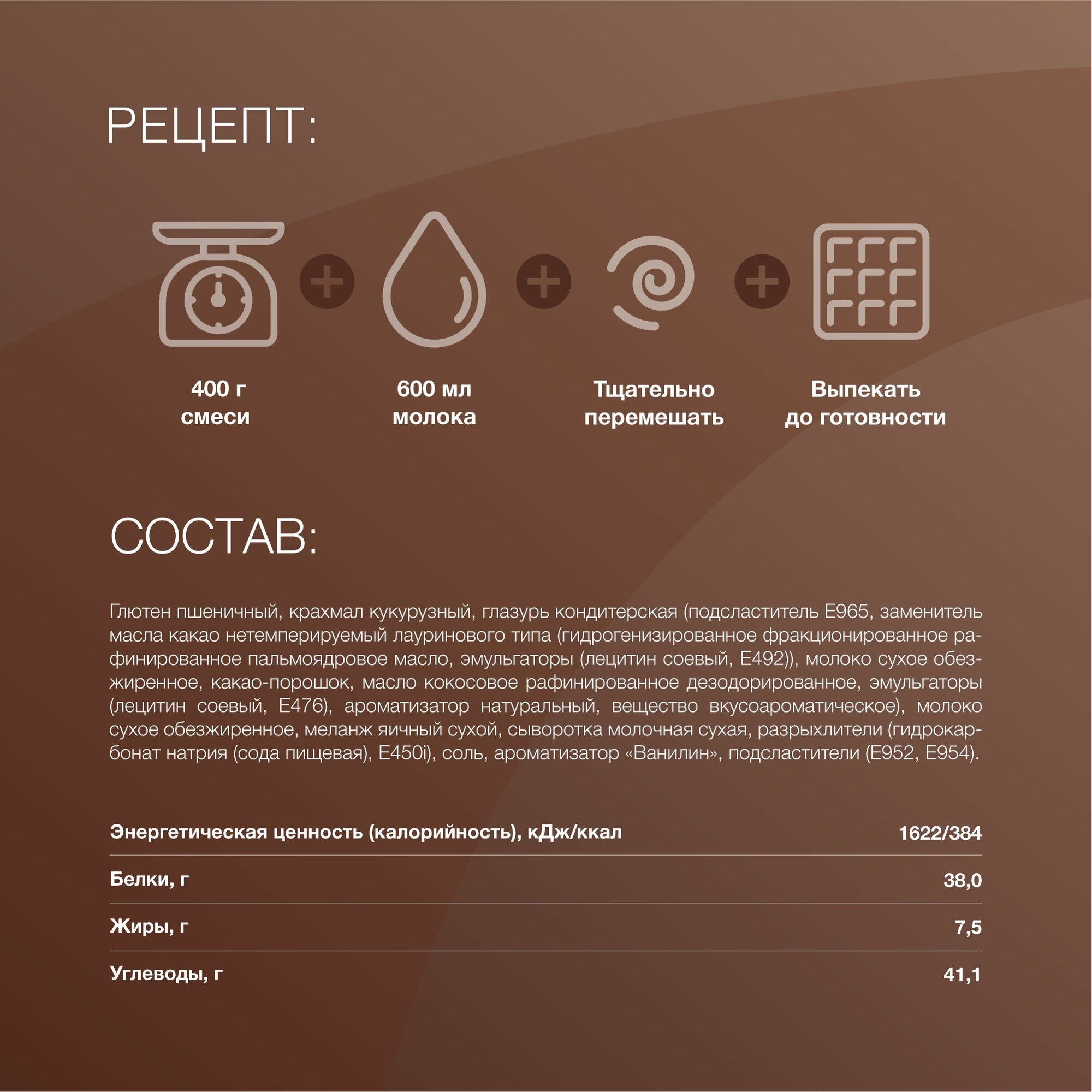 | Состав | Глютен пшеничный, крахмал кукурузный, глазурь кондитерская (подсластитель Е965, заменитель масла какао нетемперируемый лауринового типа (гидрогенизированное фракционированное рафинированное пальмоядровое масло, эмульгаторы (лецитин соевый, Е492)), молоко сухое обезжиренное, какао-порошок, масло кокосовое рафинированное дезодорированное, эмульгаторы (лецитин соевый, Е476), ароматизатор натуральный, вещество вкусоароматическое), молоко сухое обезжиренное, меланж яичный сухой, сыворотка молочная сухая, разрыхлители (гидрокарбонат натрия (сода пищевая), Е450i), соль, ароматизатор «Ванилин», подсластители (Е952, Е954). Содержит подсластители. Содержит подсластитель мальтит. При чрезмерном употреблении может оказывать слабительное действие. Содержит сахара природного (естественного) происхождения. Содержит диоксид серы. |