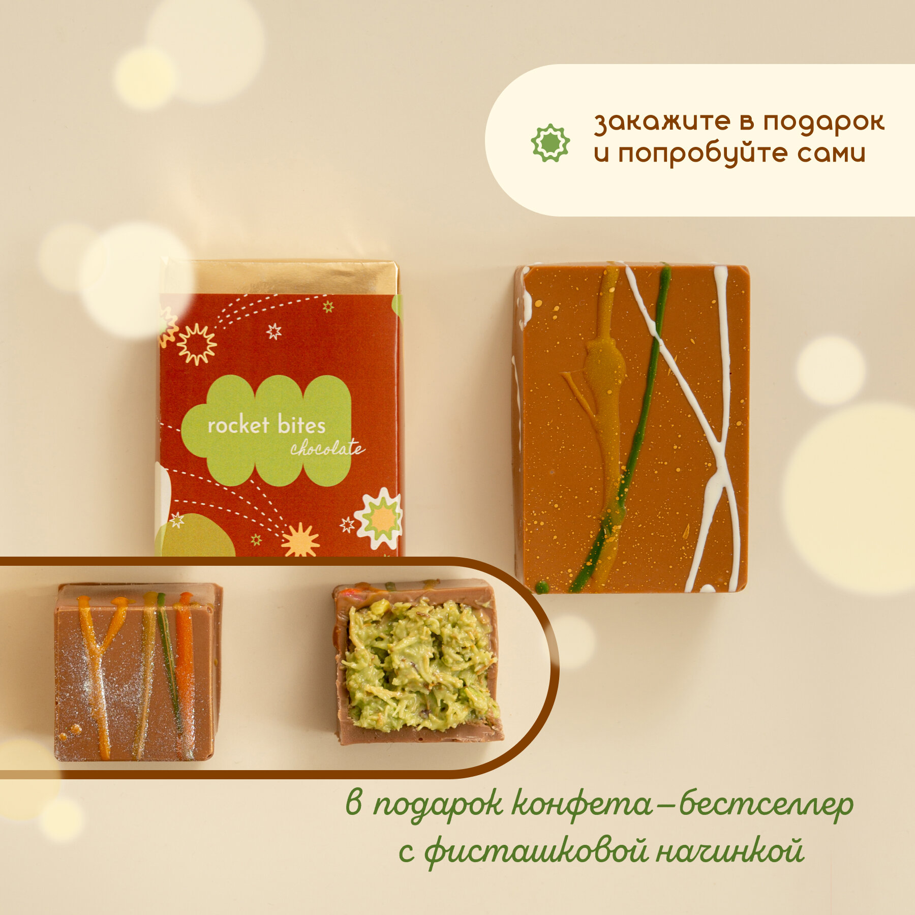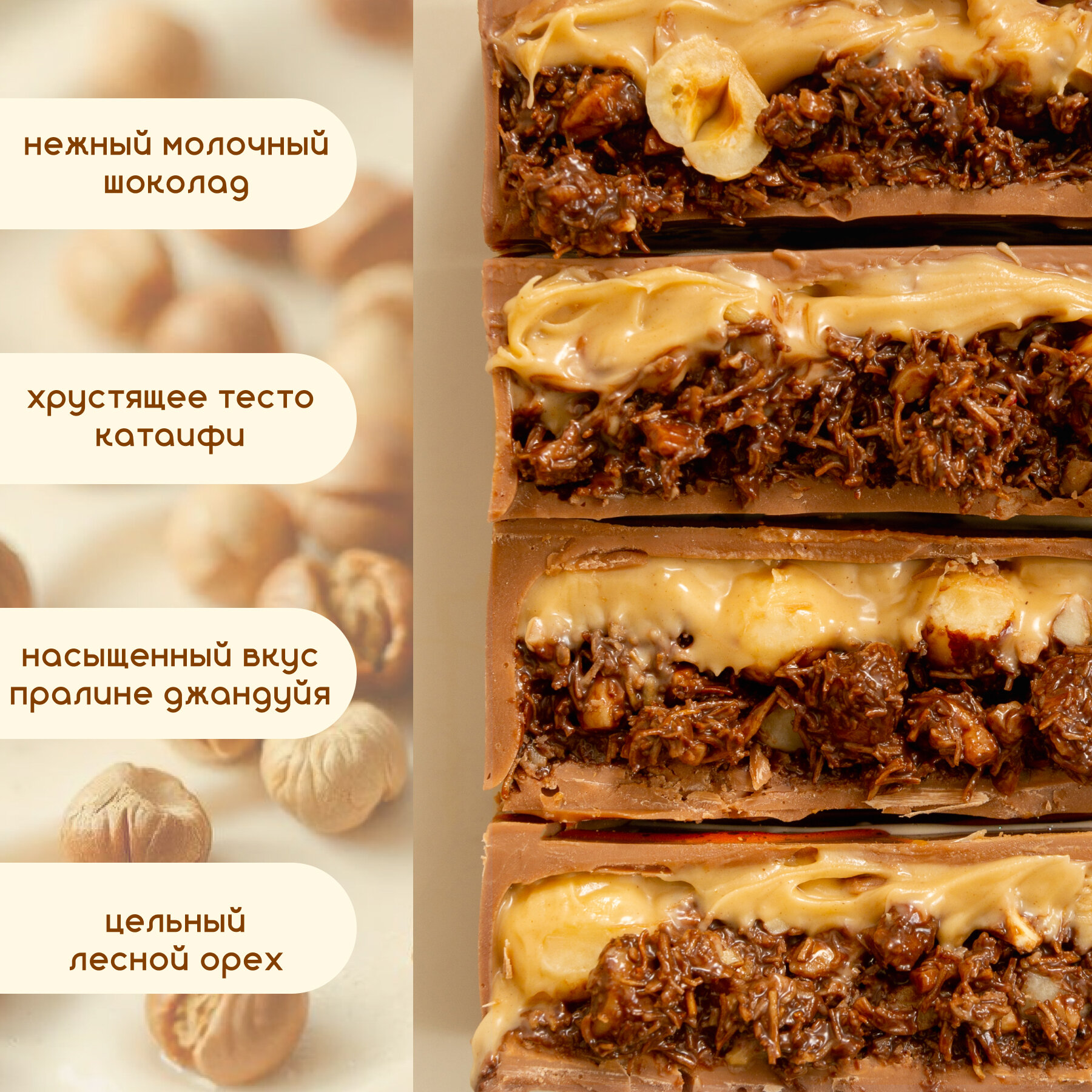 | Состав | Шоколад молочный (33%), шоколад белый (28%), фисташковая паста, сахар, кунжутная паста (таихини), тесто катаифи, орех фисташка |