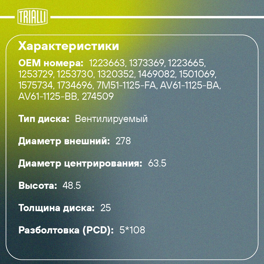 Диск тормозной для автомобилей Ford Focus II (05-) / Ford Focus III (11-) передний d=278 DF 106101 TRIALLI информация: