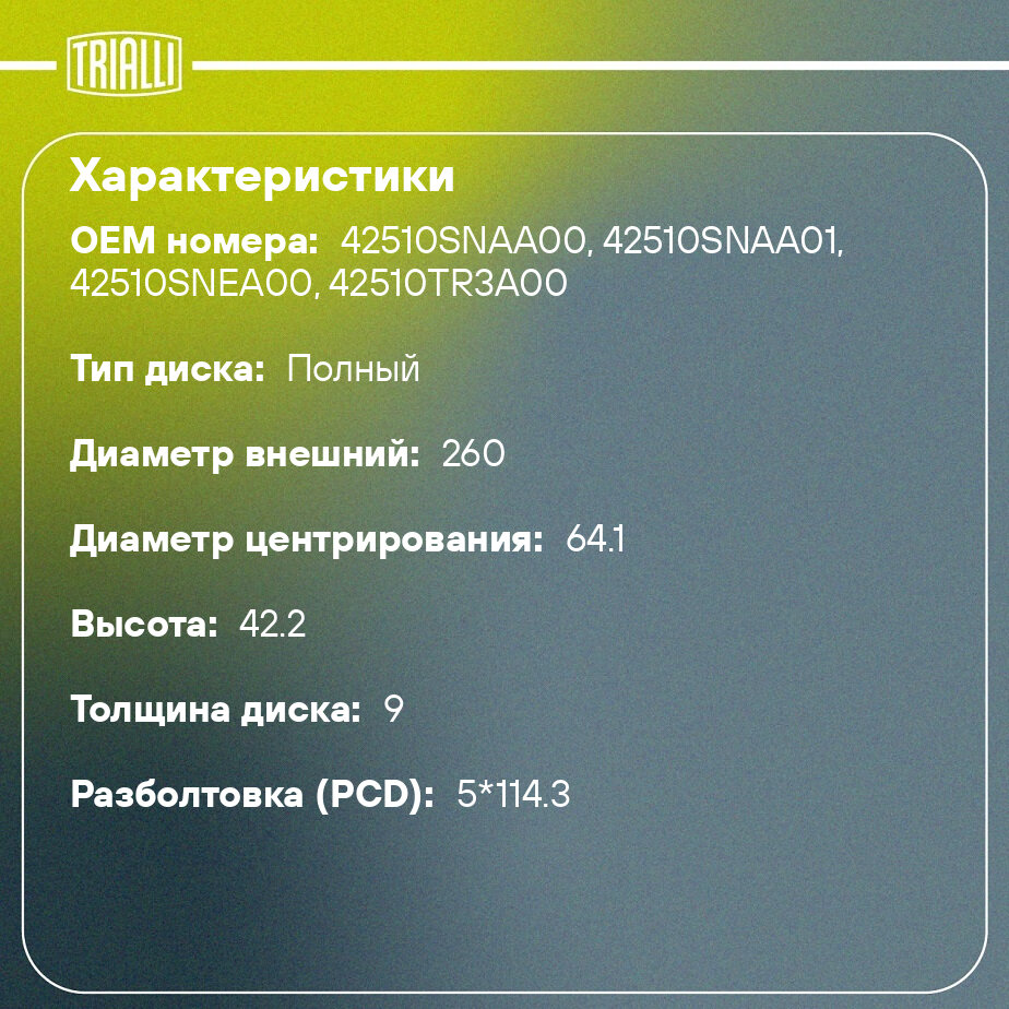 | Дополнительная информация | наружный диаметр 260мм; толщина 9мм, разболтовка (PCD): 5x114,3 |