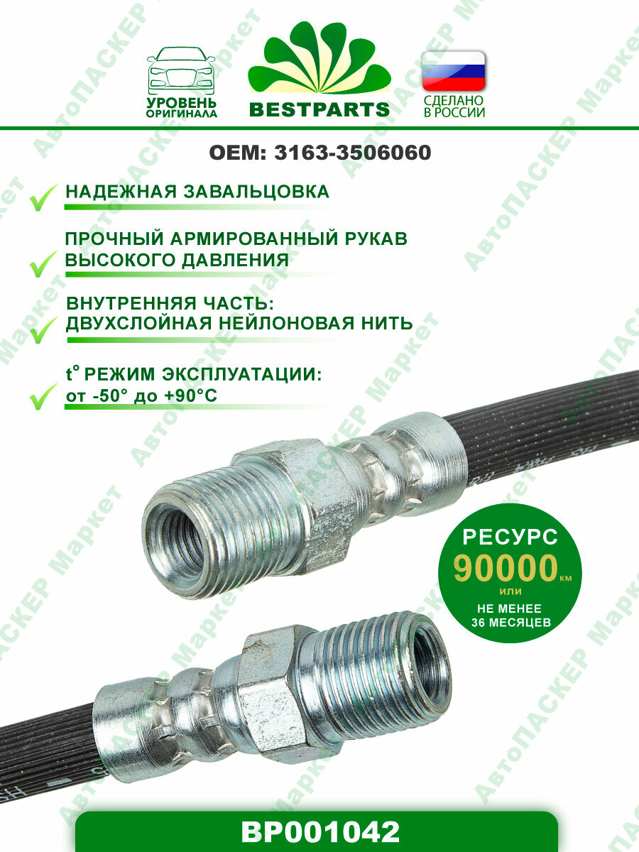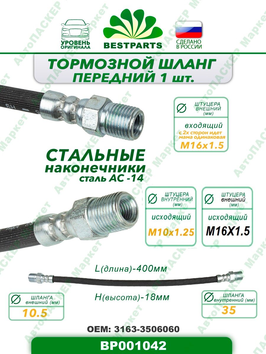 10 цен на Шланг тормозной передний, средний, 400мм, для автомобиля УАЗ 3163 Патриот, гибкий, 1 штука, BP001042, 42963