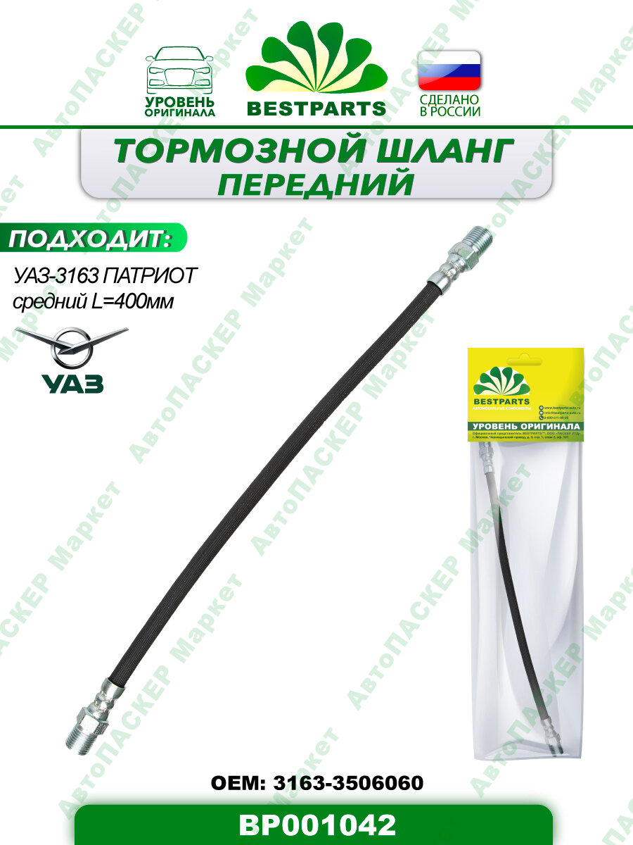 Шланг тормозной передний, средний, 400мм, для автомобиля УАЗ 3163 Патриот, гибкий, 1 штука, BP001042, 42963 информация: