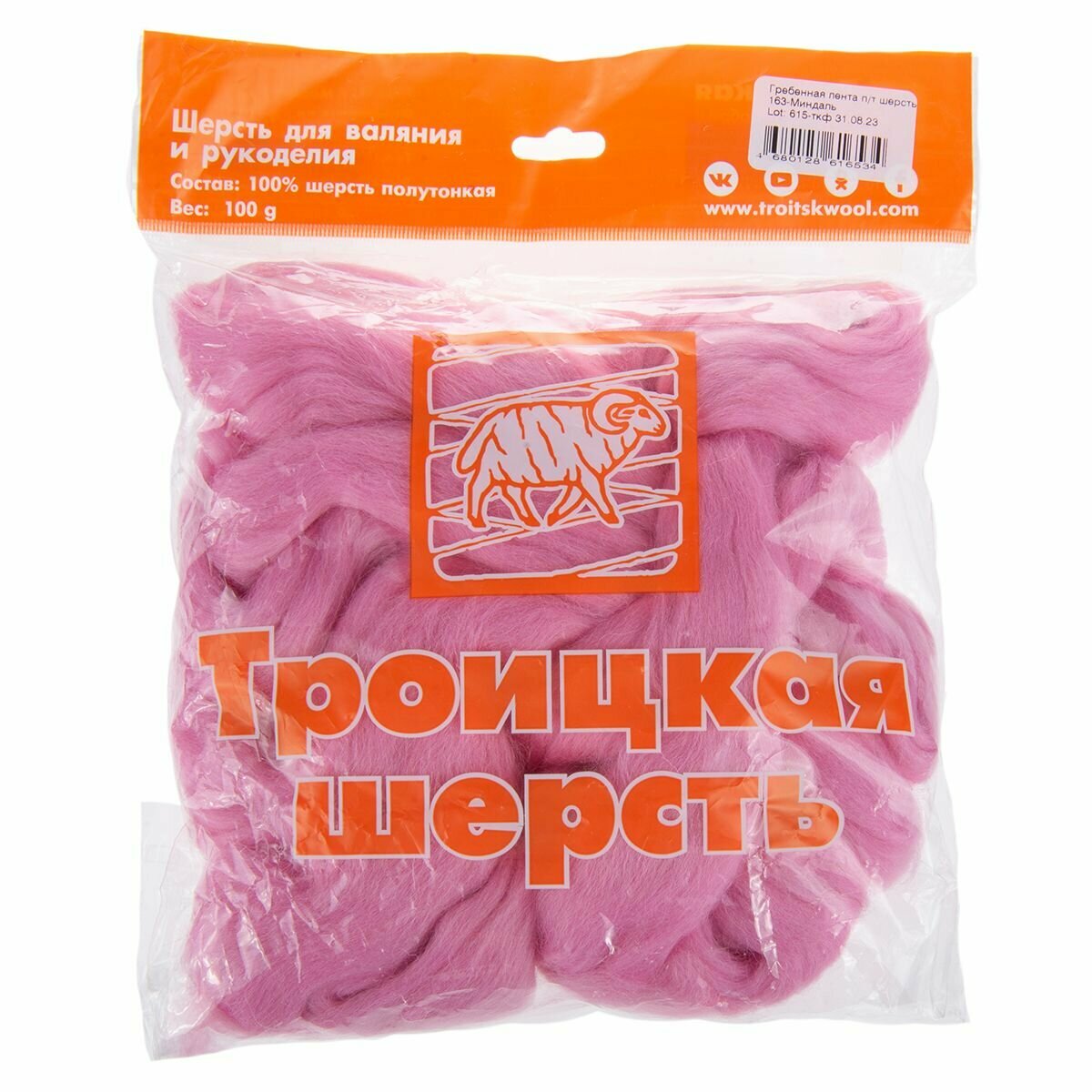 Шерсть для валяния тонкая Троицкая светлая азалия (0324), лента гребенная, 100%шерсть, 100г, 1шт