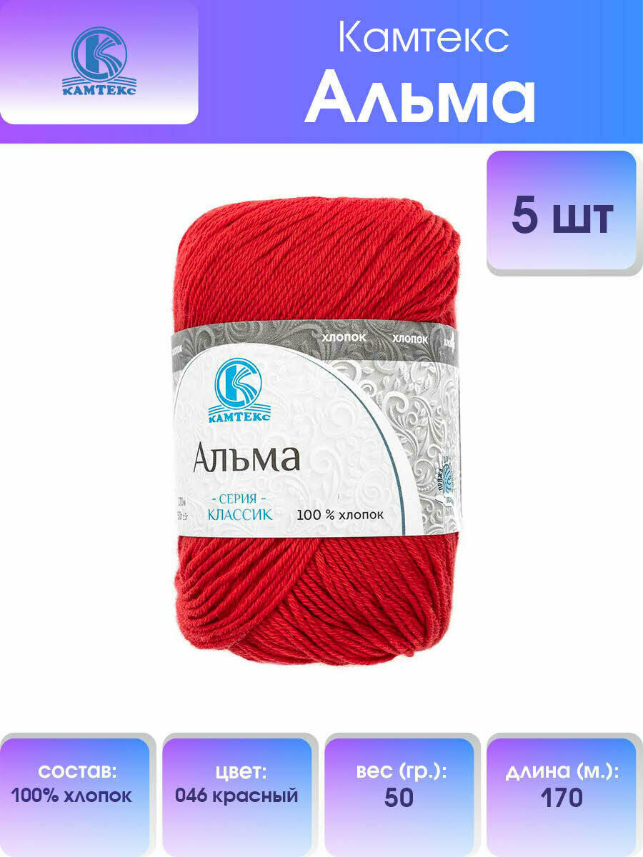 Пряжа для вязания Камтекс 'Альма' 50г, 170м (100% хлопок) (046 красный), 5 мотков информация: