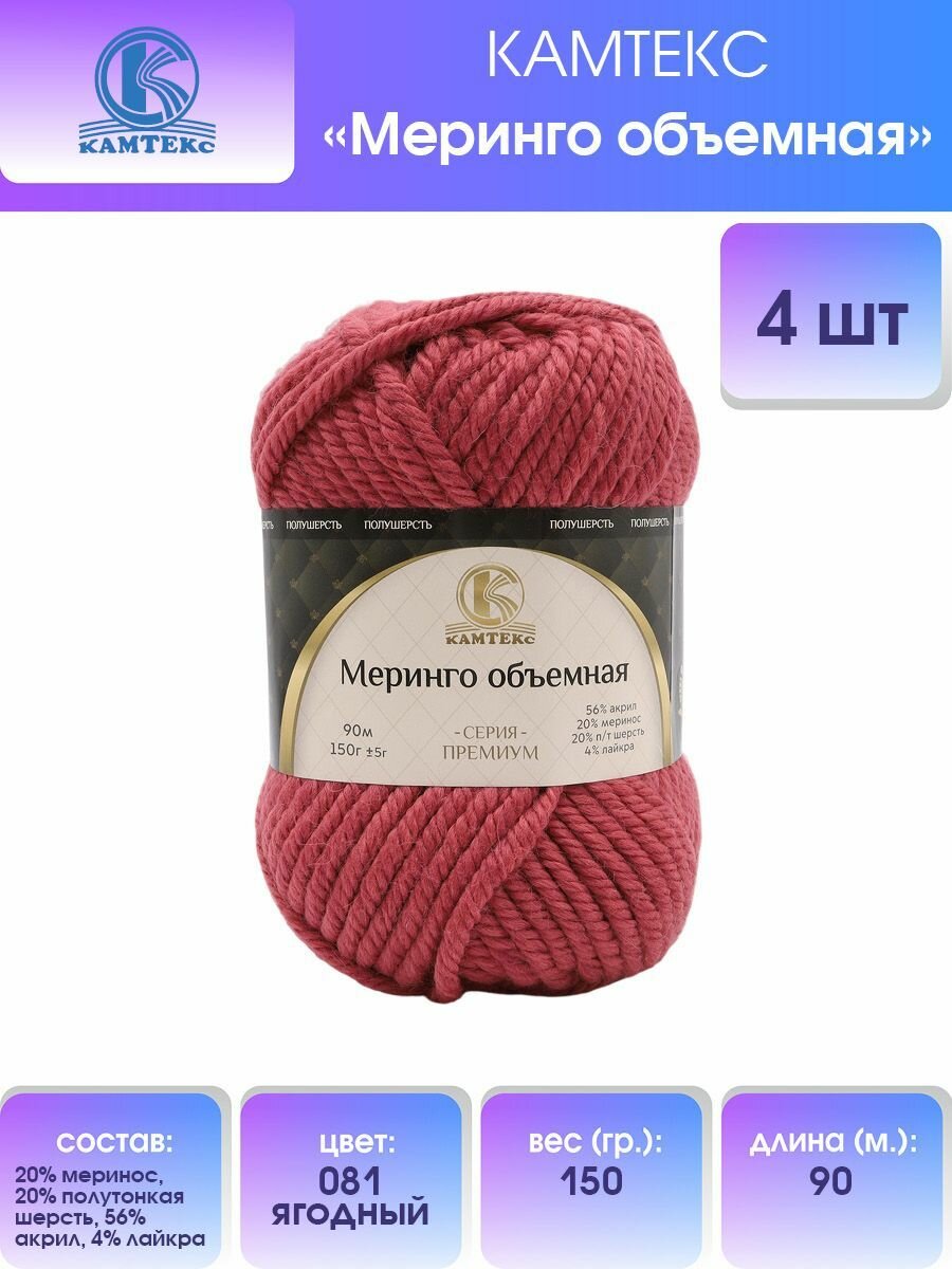 Пряжа Меринго объемная, Камтекс, ягодный - 081, 20% мериносовая шерсть, 20% п/т.шерсть, 56% акрил, 4% лайкра, 4 мотка, 150 г., 90 м. информация:
