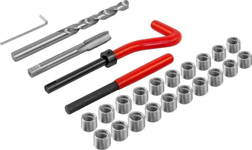 | Подробная комплектация | Сверло спиральное по металлу, по DIN 338 Метчик STI по DIN 8140-2Вороток установочный (с предохранительным кольцом для ограничения глубины)Демонтажная оправка (для удаления поводка) Ключ торцевой шестигранный Резьбовые вставки (25 шт.) |