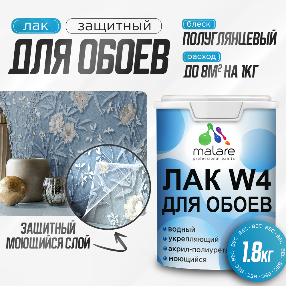 Лак для защиты обоев Malare Professional универсальный для дерева и минеральных поверхностей, водный без запаха быстросохнущий, бесцветный, полуглянцевый, 1,8 кг информация:
