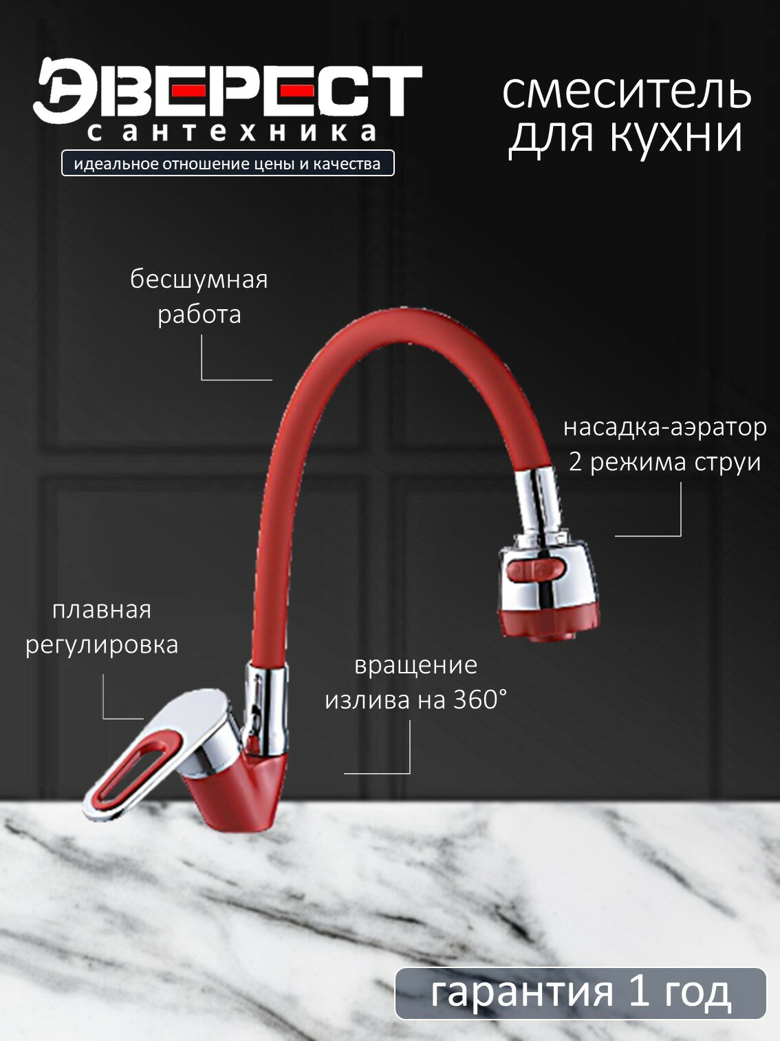Отзывы на Смеситель для кухни Эверест B58-274C, гибкий излив, цинковый сплав, красный