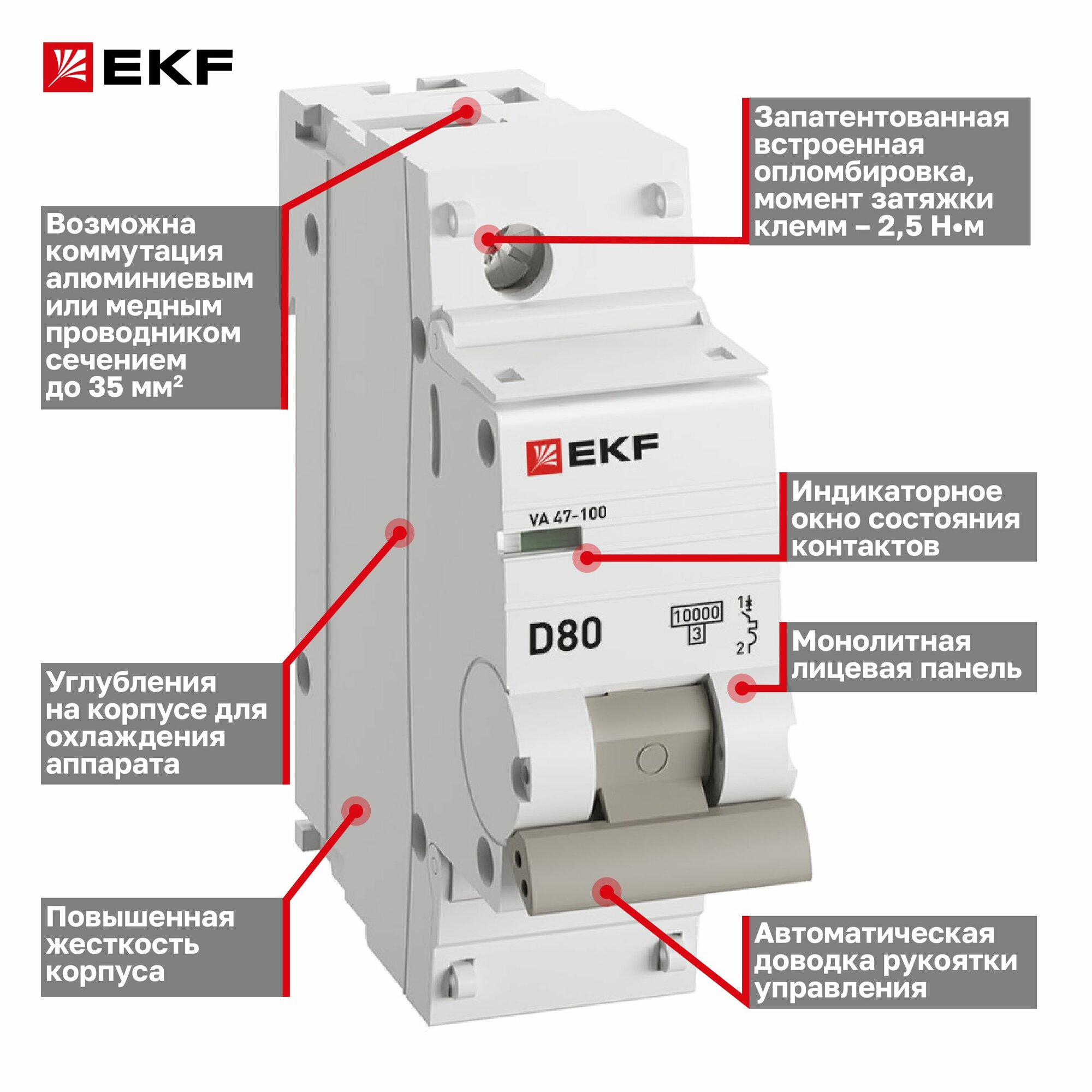 Автомат 80А, тип D, однополюсный 1P, 10kA, cо встроенной опломбировкой клемм EKF PROxima ВА 47-100 (Автоматический выключатель D80) информация: