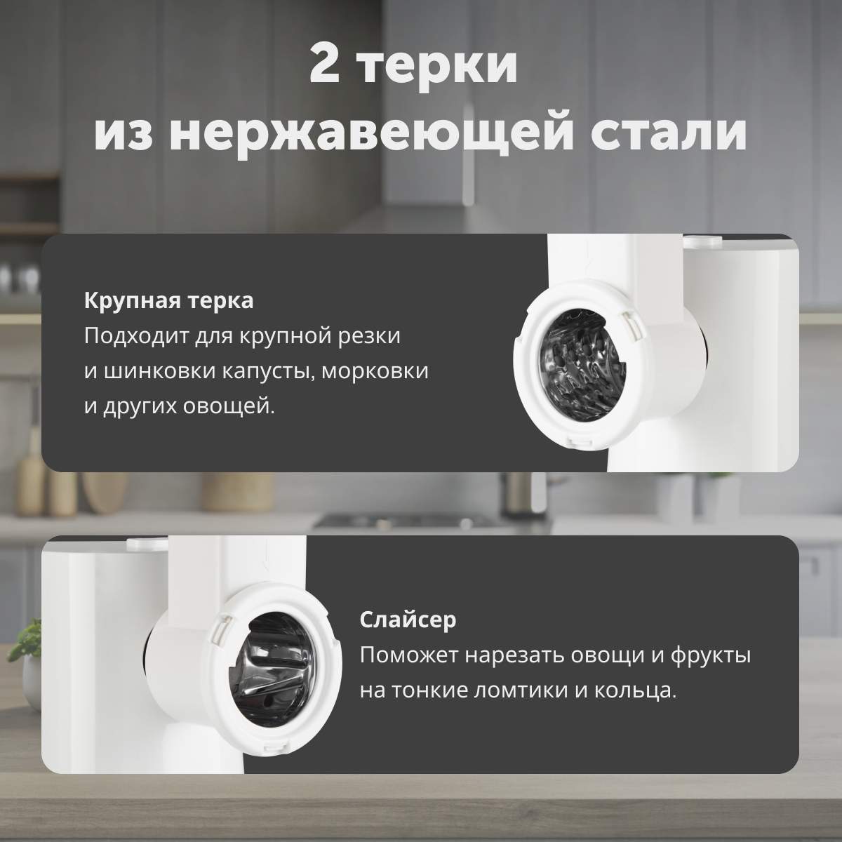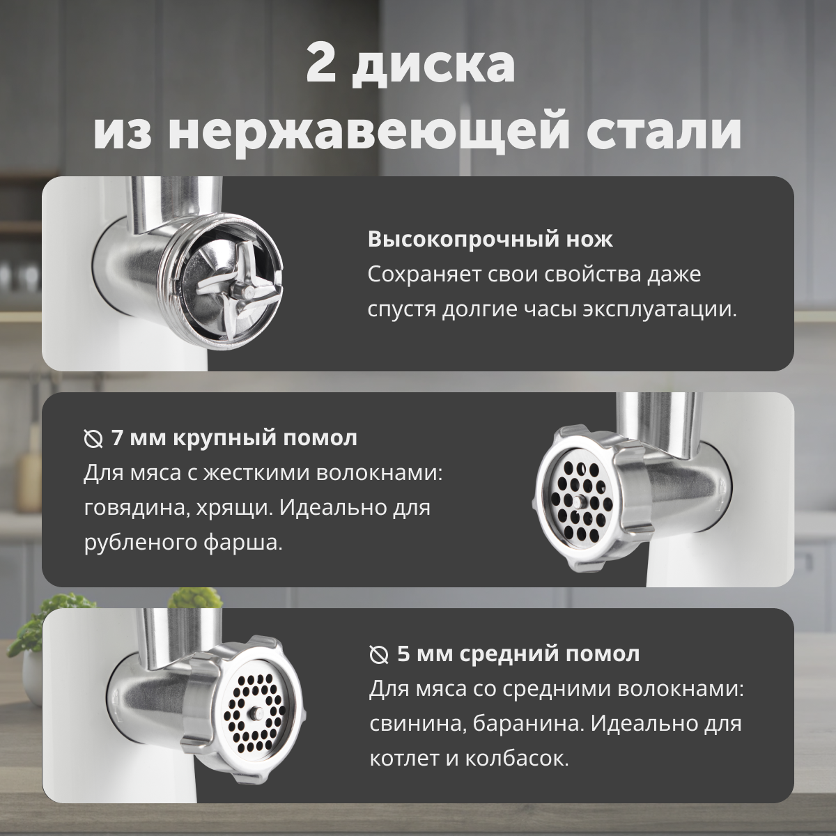 | Насадки | диск для фарша / насадка для кеббе / насадка для приготовления колбас / насадка для шинковки |