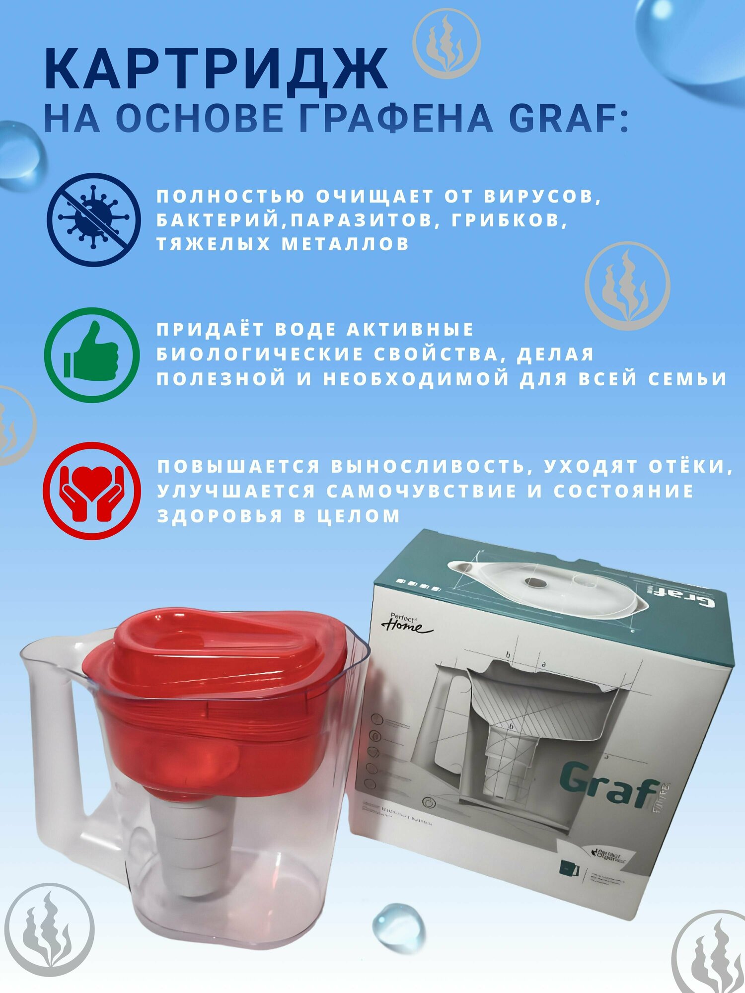 Отзывы на Кувшин для воды Perfect Organics "GRAF" с фильтром, на основе графена, сменный картридж, красный