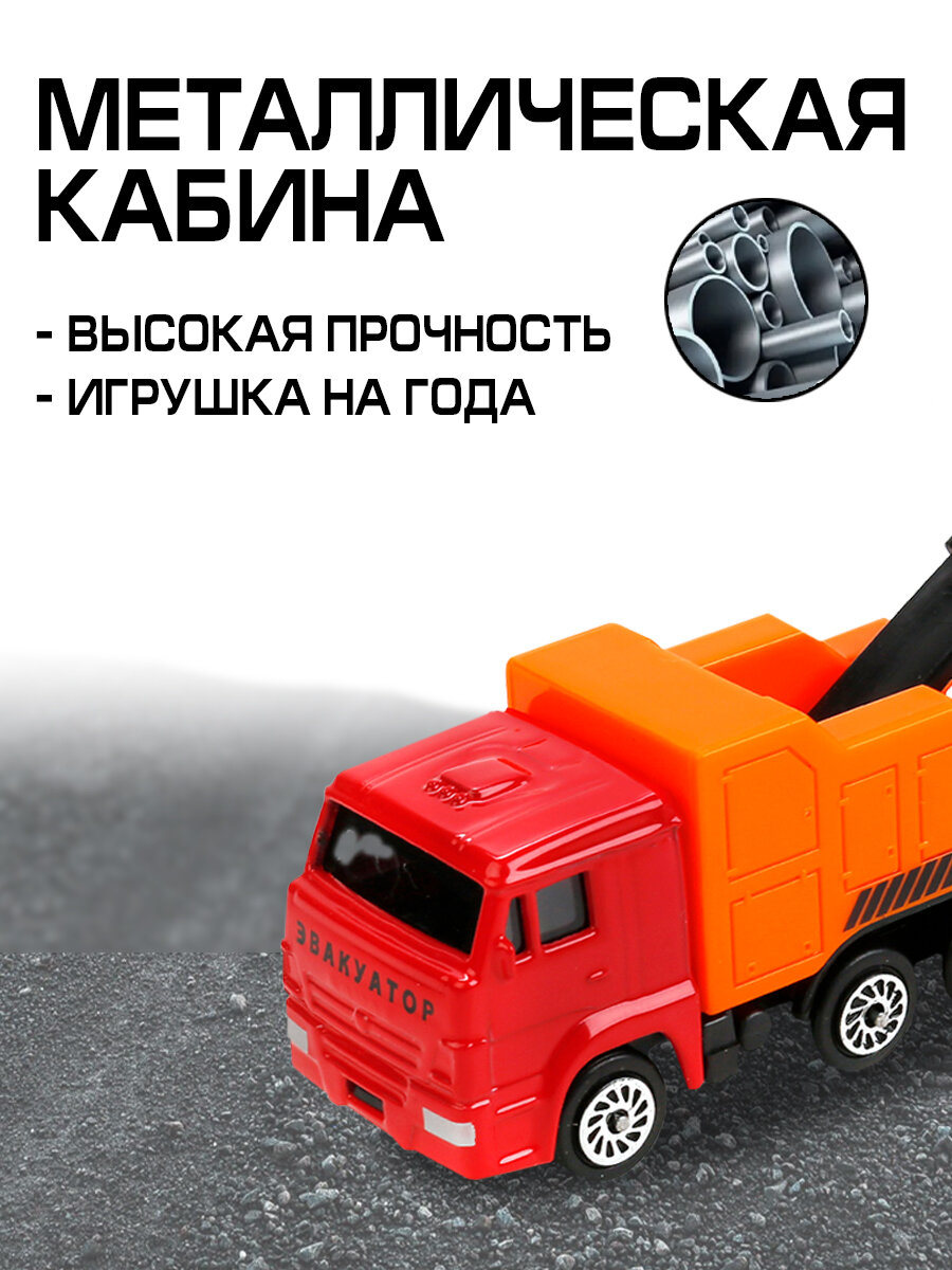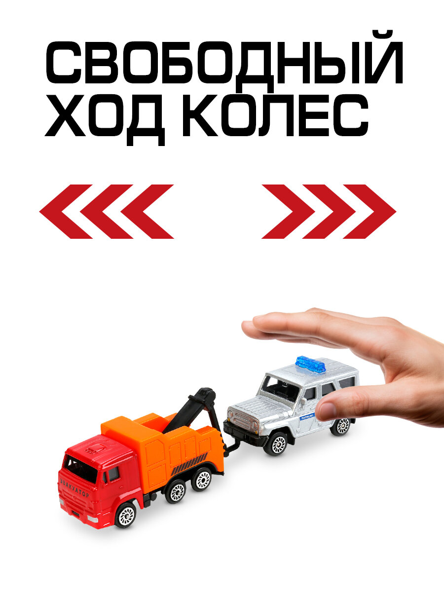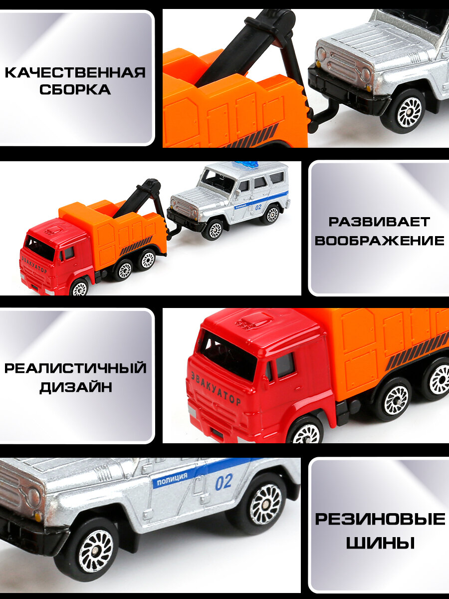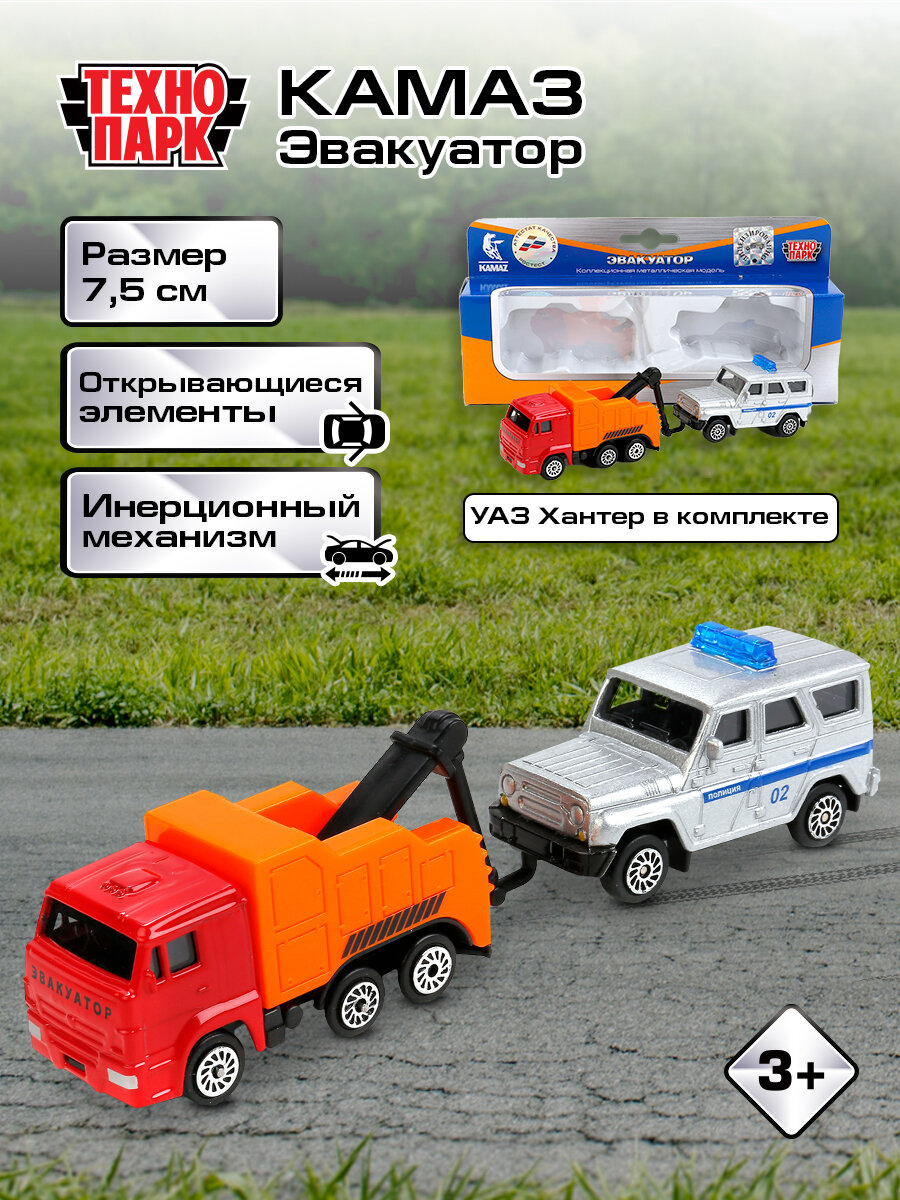 Отзывы на Машинки детские Эвакуатор Камаз и Полиция УАЗ Хантер 7.5 см, Технопарк, подвижная стрела с крюком