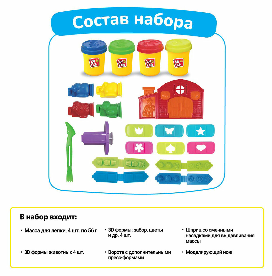 Набор для лепки Joy Doh "Farm Playset", аксессуары, 4 баночки с массой (FARM-224 pot) информация: