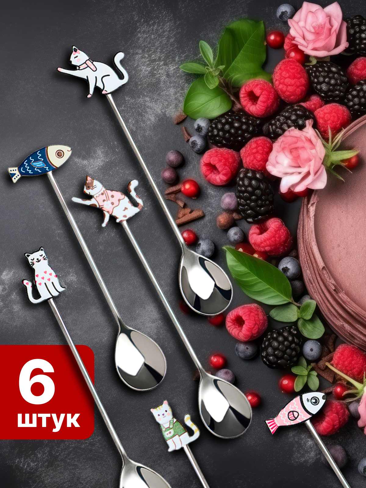 Набор чайных ложек для кофе десертные, с котиками и рыбками, 6 штук информация: