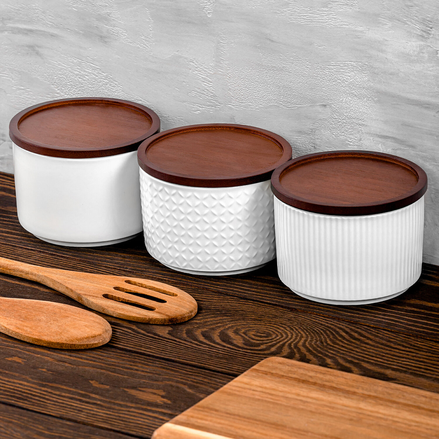 10 цен на Банка для хранения, форма для запекания 250 мл 3 шт Elan Gallery Микс, Колоранс, белый, с деревянной крышкой-подставкой