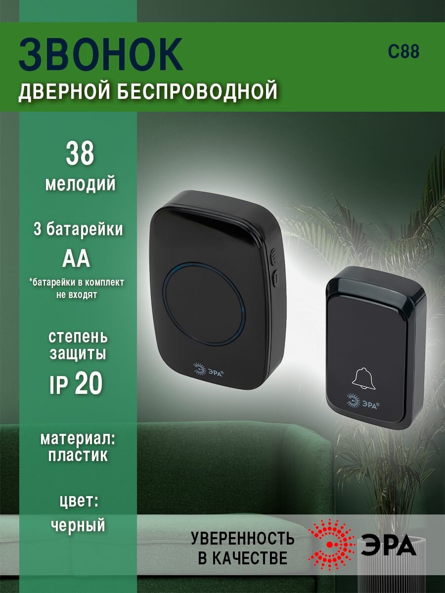 Звонок дверной ЭРА С88 беспроводной, от сети, черный, 36 мелодий информация: