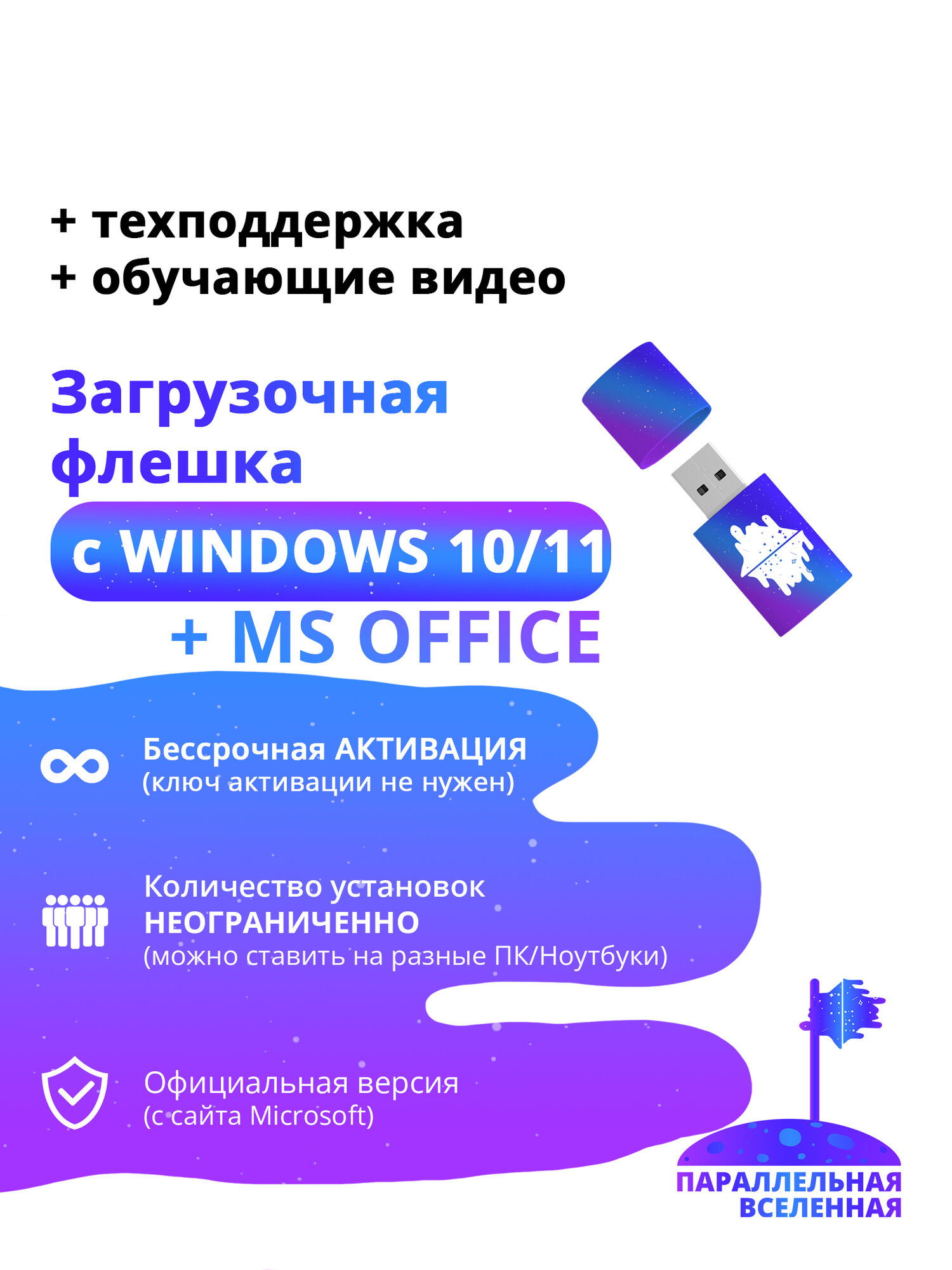 | Состав пакета | Загрузочная флешка с образами Windows 10 и Windows 11, инструкция, драйвера для интернета, программа для гарантированной установки WIndows |
