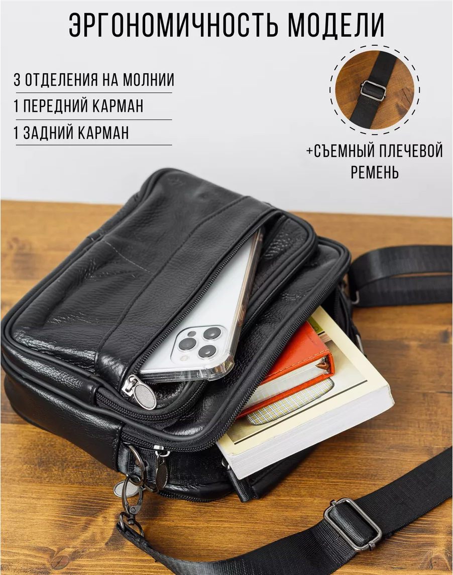 Сумка кросс-боди FOROF повседневная, натуральная кожа, плечевой ремень, внешний карман, черный